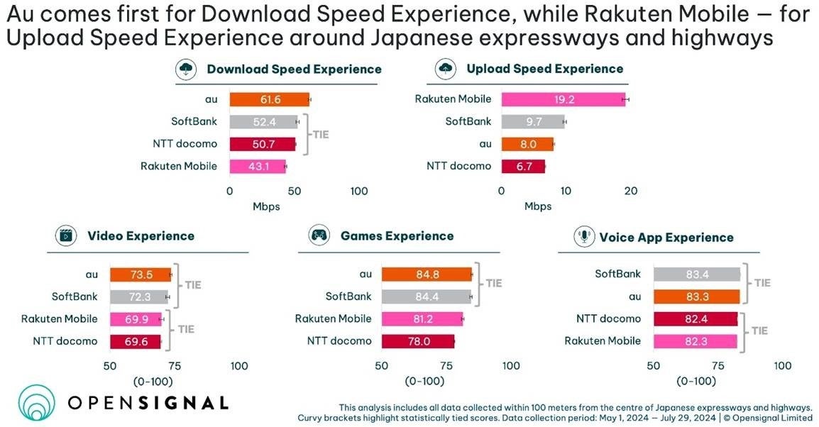 Opensignalの分析によると、日本の高速道路や自動車専用道路において、auが平均ダウンロード・スピードでトップとなり、楽天モバイルがアップロード・スピードでトップとなりました。