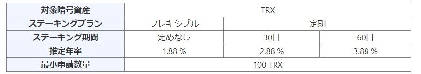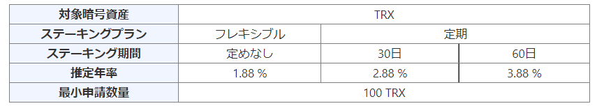 また、2022年8月24日時点で、TRXのステーキングサービスは国内取引所において初となります。(※自社調べ)
