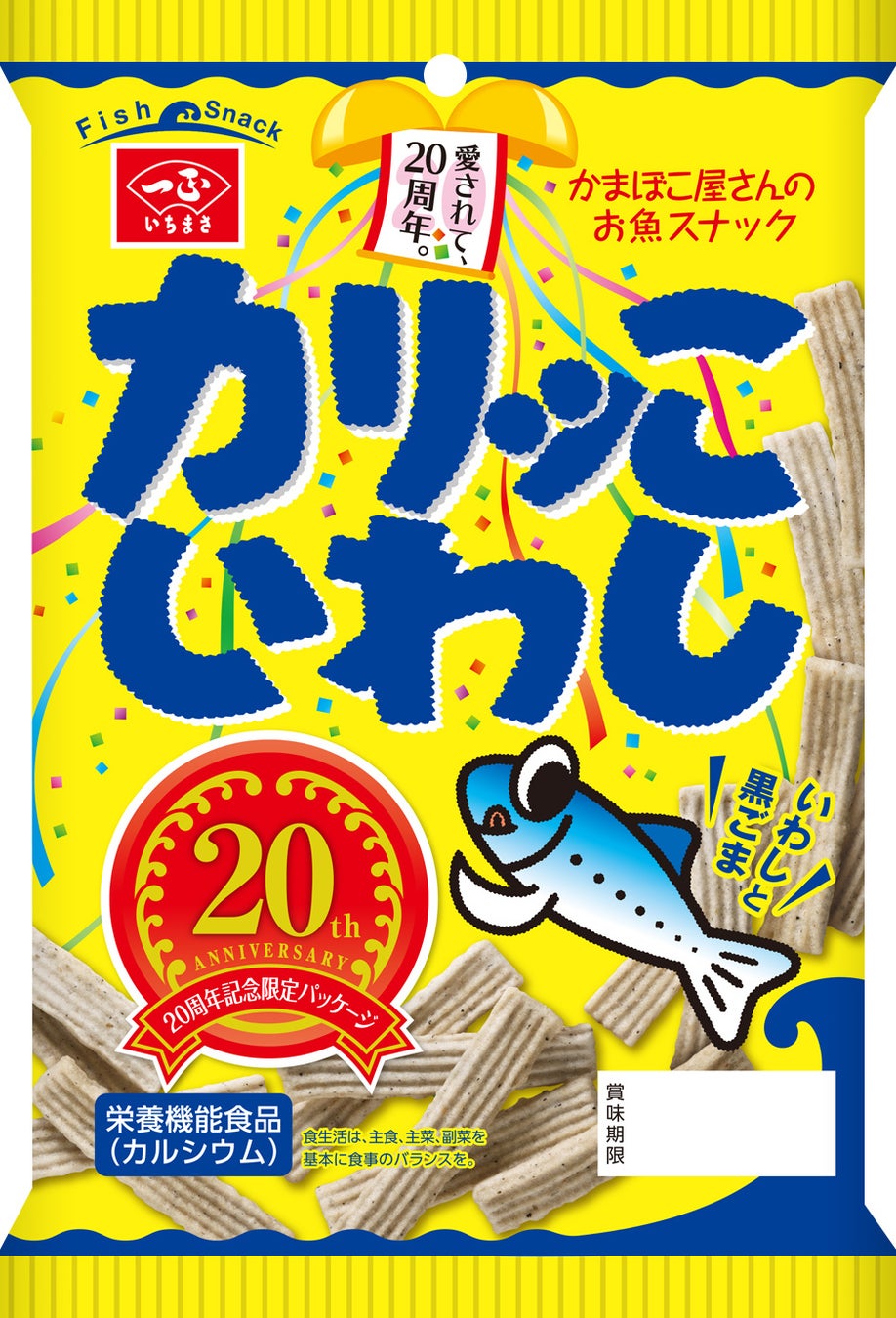 「カリッこいわし」は2002年の発売以来、多くのお客さまにご愛顧をいただいている人気商品です。シリーズとして「カリッこいわし」の他「カリッこわかめ&ひじき」「カリッこえび」の計3種類があり、それぞれ素材の旨味がたっぷりの、魚のすり身を使用したカリッとかたい食感が特長のお魚スナックです。発売20周年を記念した限定パッケージでお届けします。
