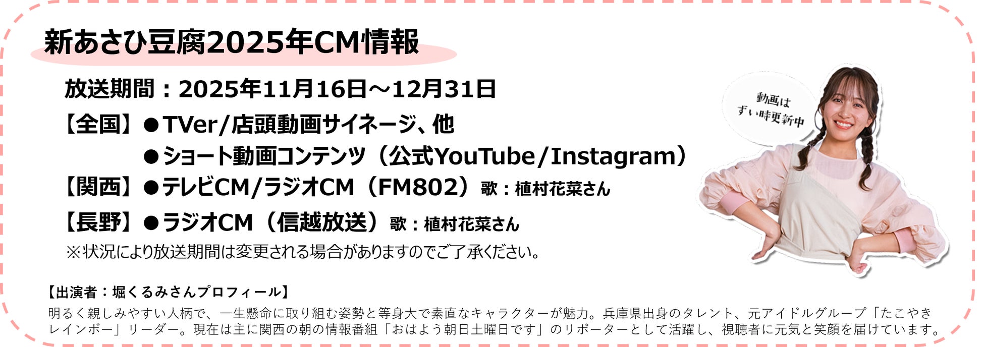 旭松食品株式会社(本社:大阪市、本店:長野県飯田市 社長:木下博隆)は、11月下旬より放送予定の新TVCM『新あさひ豆腐で健康生活』を 、2025年11月7日(金)より特設サイトおよび公式SNSでWEB先行公開いたしました。実は若年層の方がリピート頻度が高いという調査結果もある高野豆腐は、昔ながらのイメージと変わってきています。“私らしい使い方”でもっと楽しく健康的な食材だというメッセージを、関西中心に活躍中のタレント・堀くるみさんと発信していきます。