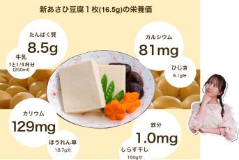 旭松食品の『新あさひ豆腐』シリーズは、従来の高野豆腐のイメージを一新。たんぱく質をはじめ、カルシウム・鉄分などの栄養の他に、「カリウム」を使用した特許製法で一般的な高野豆腐と比べ食塩相当量95%カットに成功!減塩をサポートするだけでなく、湯戻し不要、電子レンジ調理可能といった手軽さも兼ね備えています。