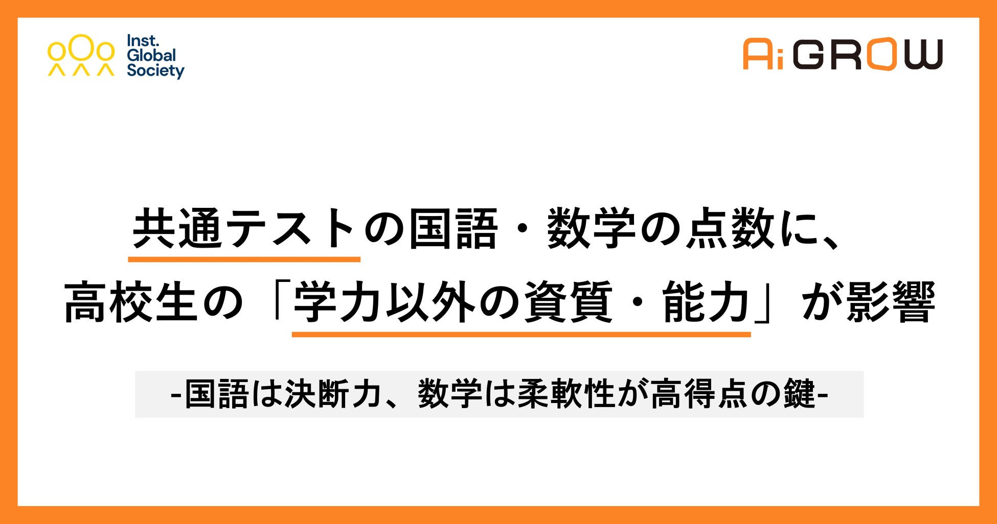 Institution for a Global Society 株式会社(本社 東京都渋谷区、代表取締役社長 福原 正大、以下 IGS)は、東京都の私立高等学校3年生の大学入学共通テスト(以下、共通テスト)と、高校3年間の従来の学力以外の資質・能力(思考力・表現力・判断力など)の関係を分析しました。その結果、共通テストの国語・数学の点数に、学力以外の資質・能力が影響していることがわかりました。特に、国語は高校1年生・2年生時点での「決断力」の高さ、数学ⅠAは高校3年生時点の「柔軟性」の高さが、共通テストの高得点に影響していました。