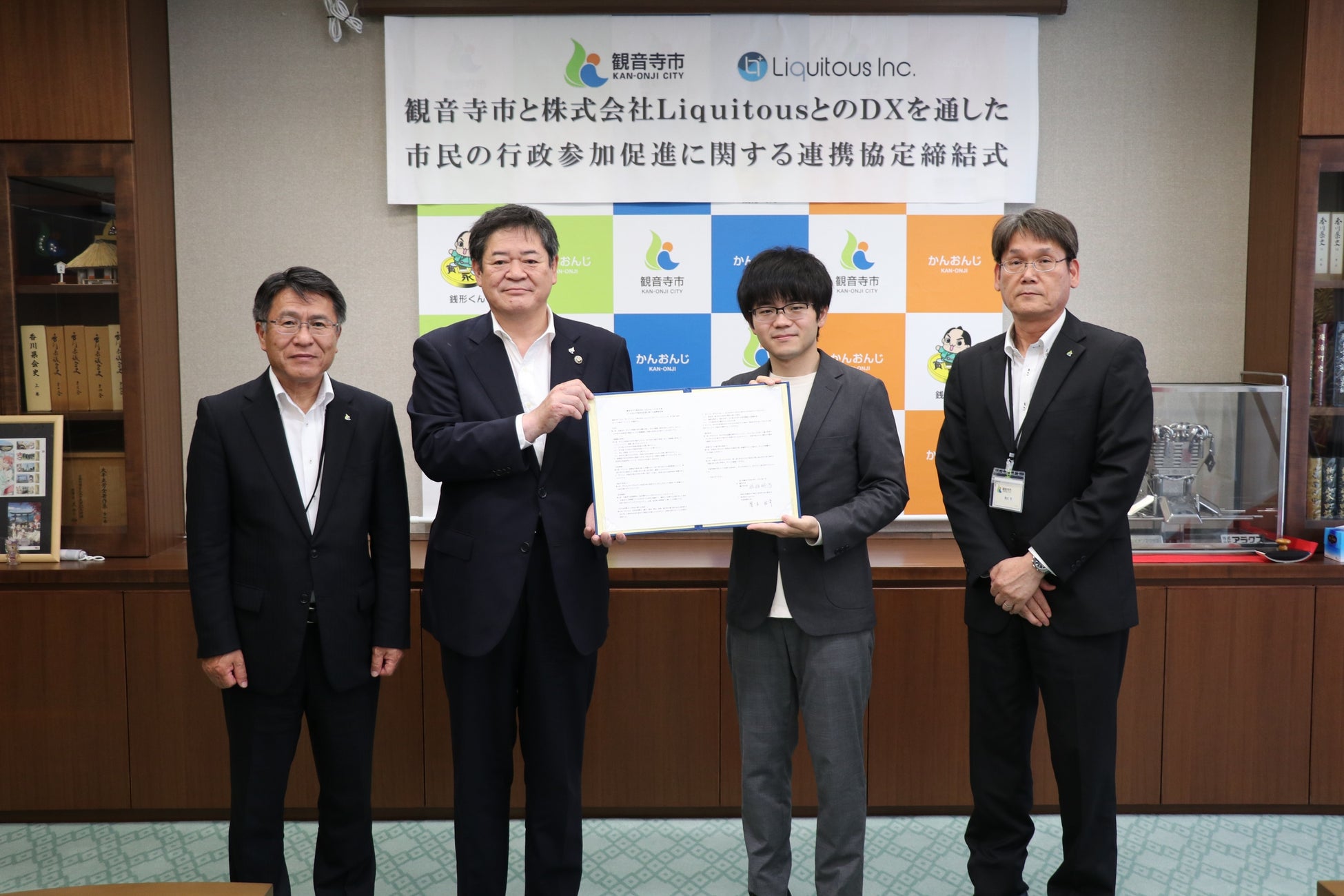 株式会社Liquitous(本社:神奈川県横浜市、代表取締役CEO:栗本 拓幸)は、香川県観音寺市(市長:佐伯 明浩)と令和5年6月8日に「観音寺市と株式会社LiquitousとのDXを通した市民の行政参加促進に関する連携協定」を締結しました。