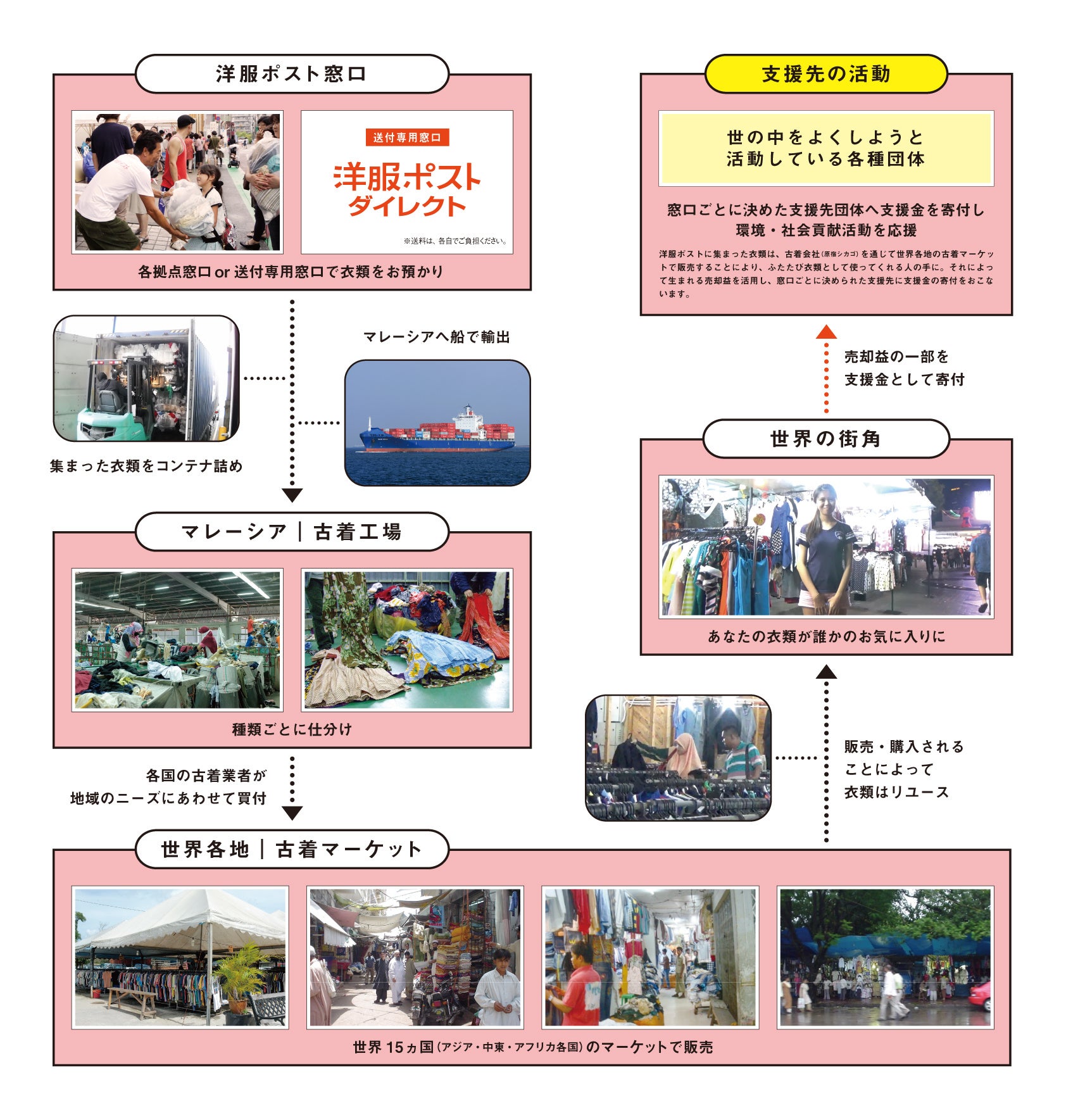 洋服ポストに集まった衣類は、次のような手順でリユースされます。