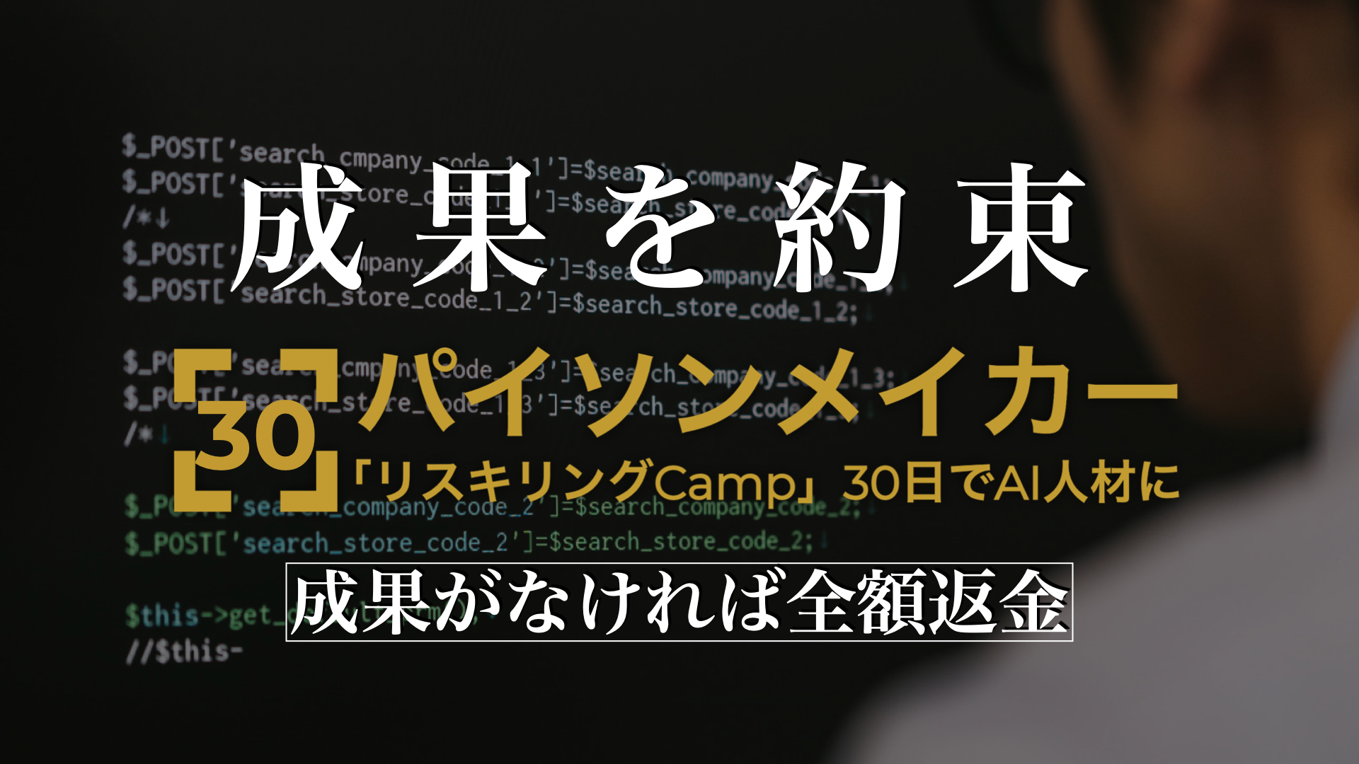 パイソンメイカー「リスキリングCamp」は、ChatGPTや生成系AIを使いこなし、AI/DXに関する体系的な知識を身につけ、新規事業や社内の業務高度化を自身が主導して進めていく「非エンジニア向けの」DX人材排出講座です。30日間のスパルタ式Campになります。