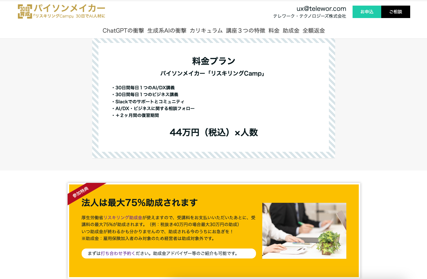 助成金活用で最大75%が助成されます。成果が出なかったら全額返金保証付き。