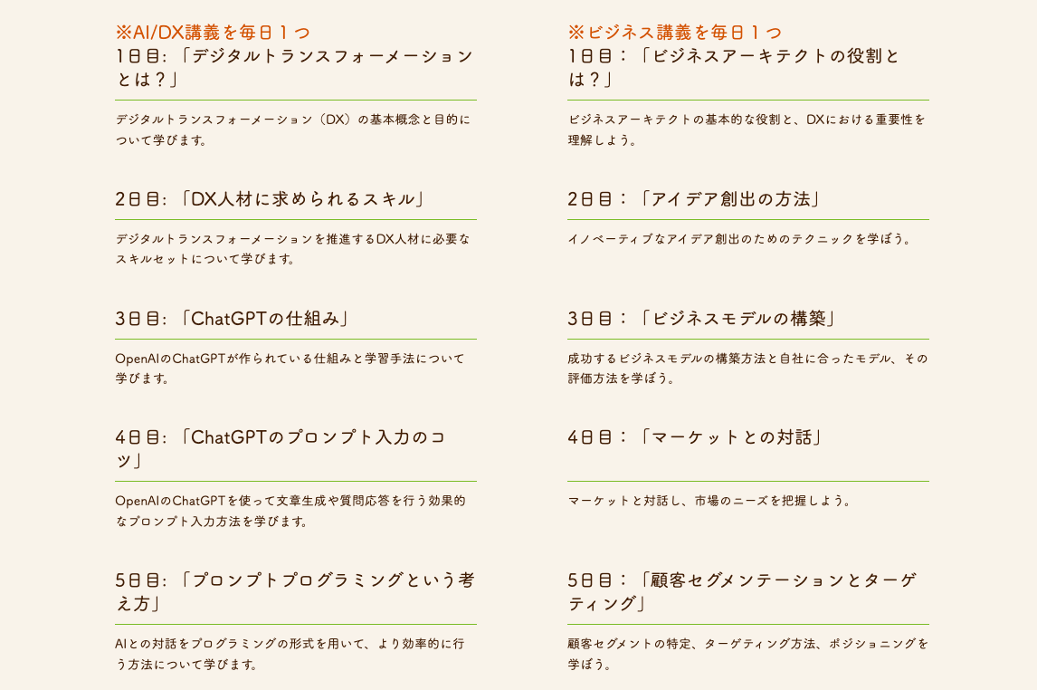 経済産業省が提唱するデジタルスキル標準(DX人材の定義)でいう、ビジネスアーキテクト人材を育成する、非エンジニア向けの講座になっております。Pythonやプログラミングの講義は一切ありません。