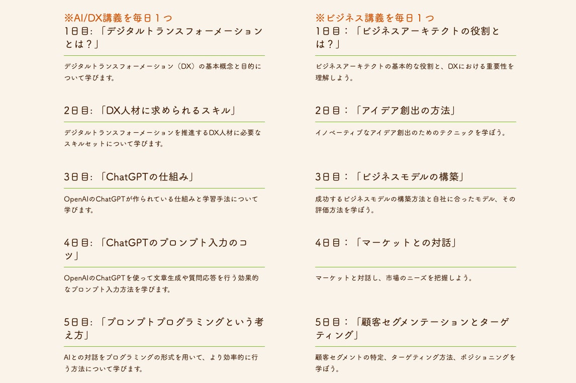 AIを作るのではなく「AIツールを使い倒す」ことがこの講座の特徴です。AIツールを使いこなしつつ、ビジネススキルを身につけることで、社内のDXを実践できるDX人材の排出を目指します。Pythonやプログラミングの講義は一切ありません。
