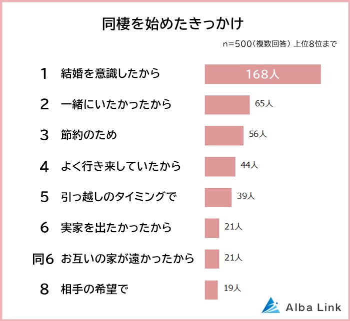 同棲経験のある500人に「同棲を始めたきっかけ」を聞いたところ、圧倒的1位は「結婚を意識したから(168人)」でした。2位「一緒にいたかったから(65人)」、3位「節約のため(56人)」と続きます。