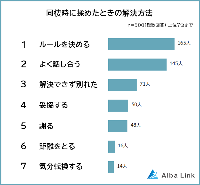 最後に「同棲時に揉めたときの解決方法」を聞いたところ、1位になったのは「ルールを決める(165人)」でした。2位「よく話し合う(145人)」、3位「解決できず別れた(71人)」、4位「妥協する(50人)」と続きます。