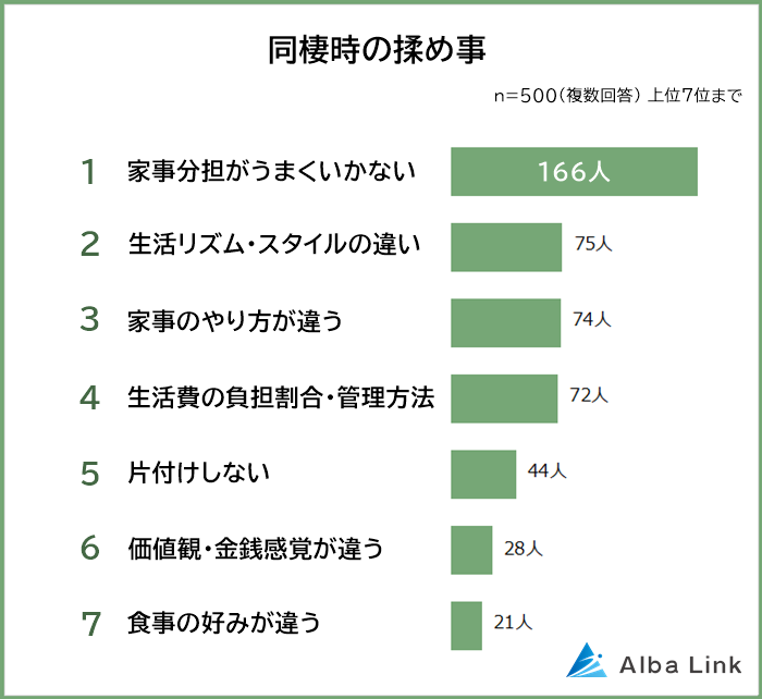 「同棲時の揉め事」を聞いたところ、1位になったのは「家事分担がうまくいかない(166人)」でした。2位「生活リズム・スタイルの違い(75人)」、3位「家事のやり方が違う(74人)」、4位「生活費の負担割合・管理方法(72人)」と続きます。