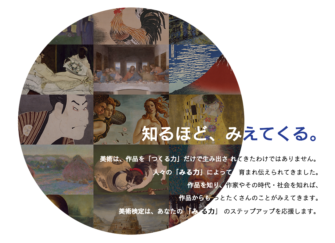 一般社団法人美術検定協会が企画運営している民間検定試験です。美術の知識と知見を高め「みる力」を養うプログラムとして、4級(初級)〜1級(最上級)までの4レベルを設けています。