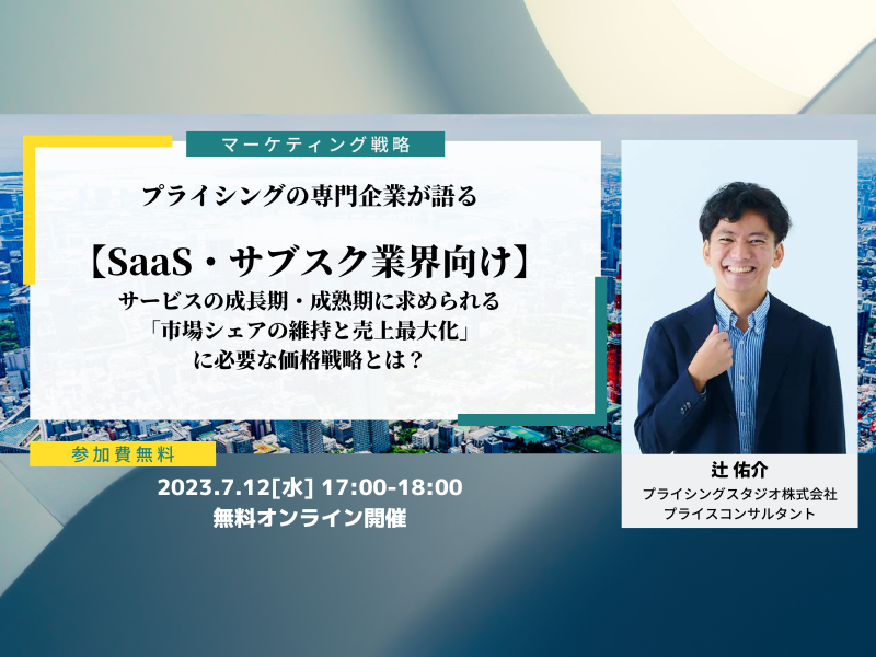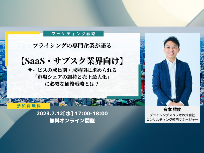 プライシングスタジオ株式会社 7月12日(水) 【SaaS・サブスク業界向け】成長期・成熟期のサービスに求められる「市場シェアの維持と売上最大化に必要な価格戦略」について徹底解説セミナーが開催決定!