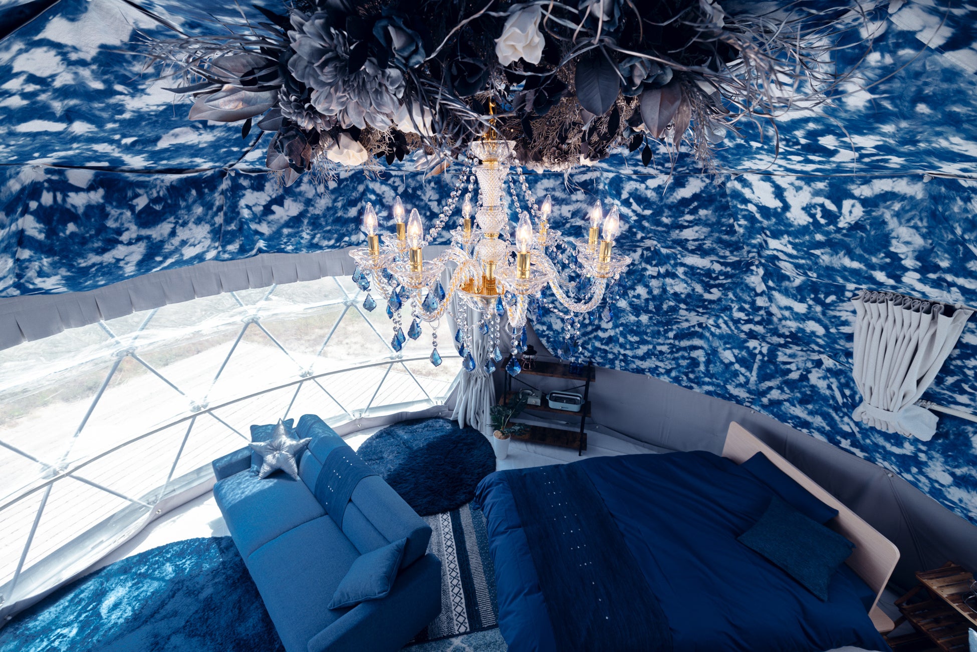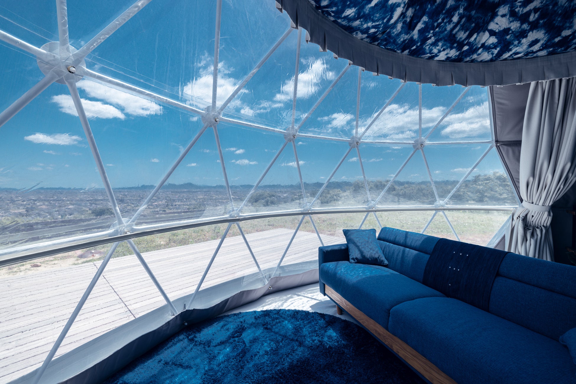 岡山のグランピング施設に「岡山らしさ」を藍色の空に喩え表現された大空間、