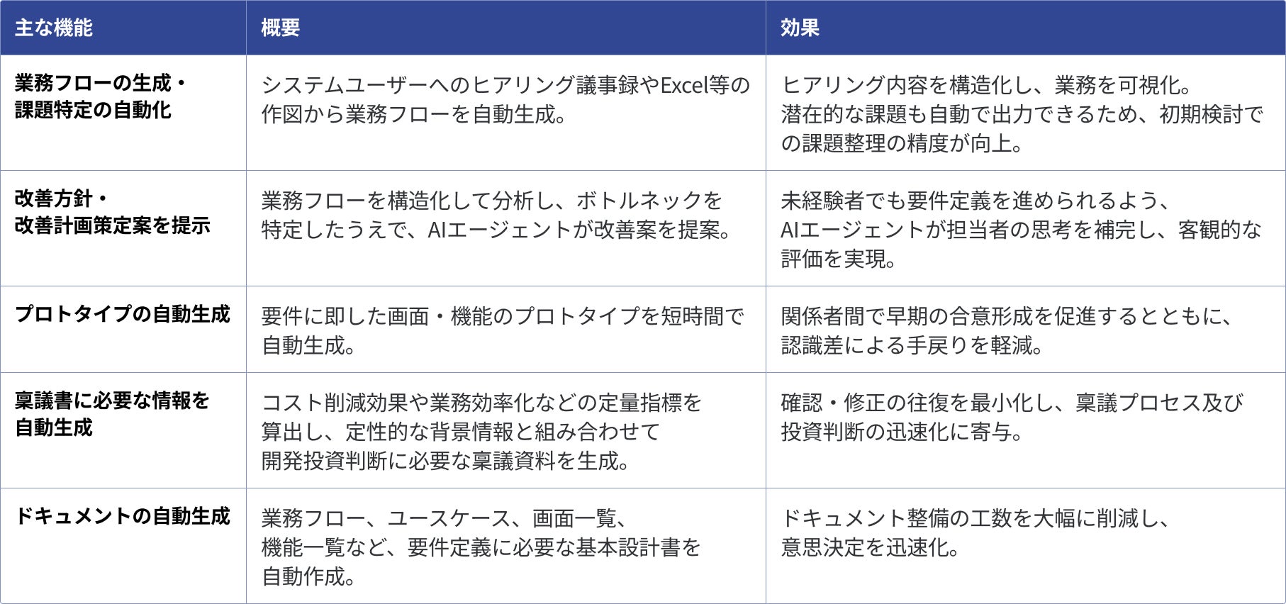 Acsim(アクシム)は、属人化しやすい要件定義において、AIが推進者の思考を補完・強化し、誰もが要件定義ができる世界を実現する生成AIプラットフォームです。現状把握や課題抽出、改善方針提示、本格的なプロトタイプ構築、稟議支援、設計書の自動出力まで、要件定義に必要なプロセスを一貫して支援します。生成された設計情報は構造化データとして蓄積され、実装・テストといった後続工程でも活用可能。開発全体の品質を高め、意思決定の精度とスピードを飛躍的に向上させます。