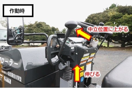 【3】人を検知すると自動でシリンダーが伸長、前後進レバーを中立の位置に戻し、減速・停止(パーキングブレーキが自動作動)する