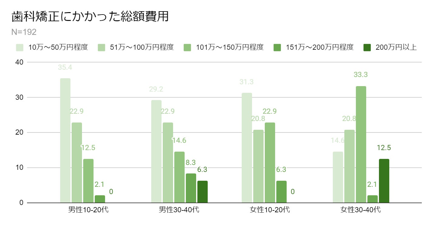 調査の結果によると、30-40代において、歯科矯正への投資が増加していることが明らかになりました。特にこの年代の方々は、美しく健康的な笑顔を求める中で、高額な矯正治療を選択する傾向にあります。なかでも女性はこの傾向がより顕著で、男性と比較して歯科矯正にかける費用が高いことがわかりました。これは、美容と自己投資に対する意識の高さが影響していると考えられます。