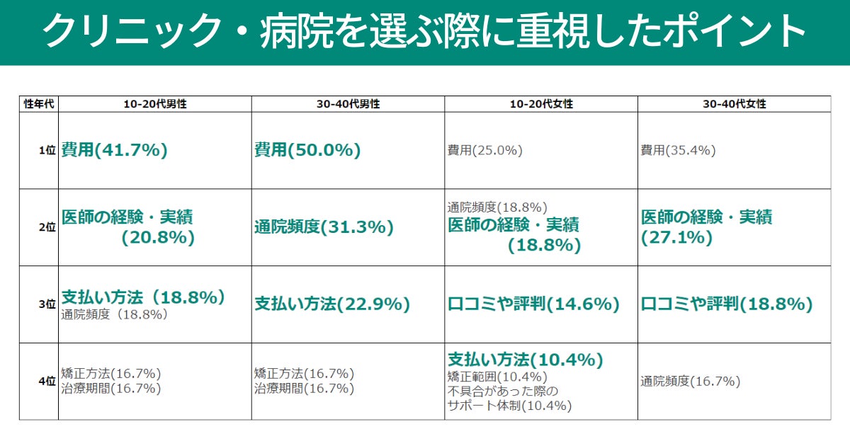 「クリニックや病院を選ぶ際に重視されるポイント(上の表1)」では、性別によって異なる結果が出ました。全体としてはやはり「費用」が最も重視されるポイントである一方で、男性は特に「歯科矯正にかかった総額費用」に関して費用を抑える傾向があり、「費用」の面でより慎重な選択をしている傾向が明らかになりました。対照的に、女性は「医師の経験・実績」「口コミや評判」を重要視し、選択の前に他者からのレビューなどを基に決定を下す傾向があるような結果が推察されます。