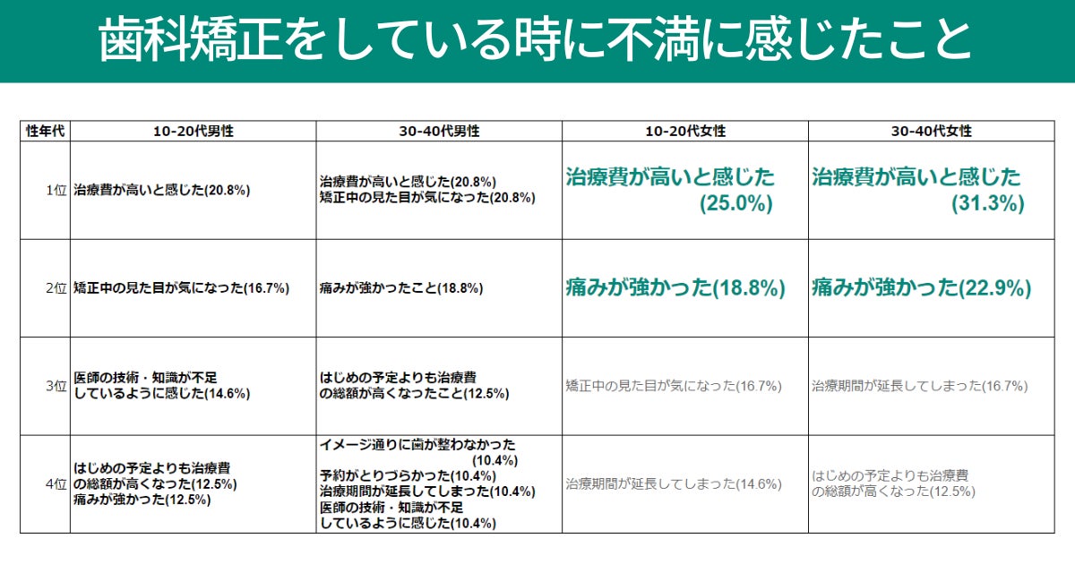 歯科矯正への不満は、男性は明確な不満を感じづらい?傾向があり、女性は「価格」と「痛み」が主な回答結果に