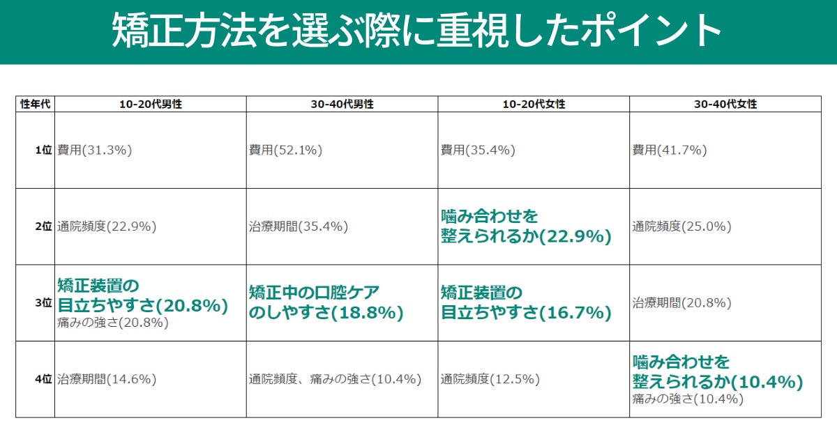 矯正方法選びにおいて、女性は噛み合わせを、若者は矯正中の見た目を、30代以上の男性はケアのしやすさを求める