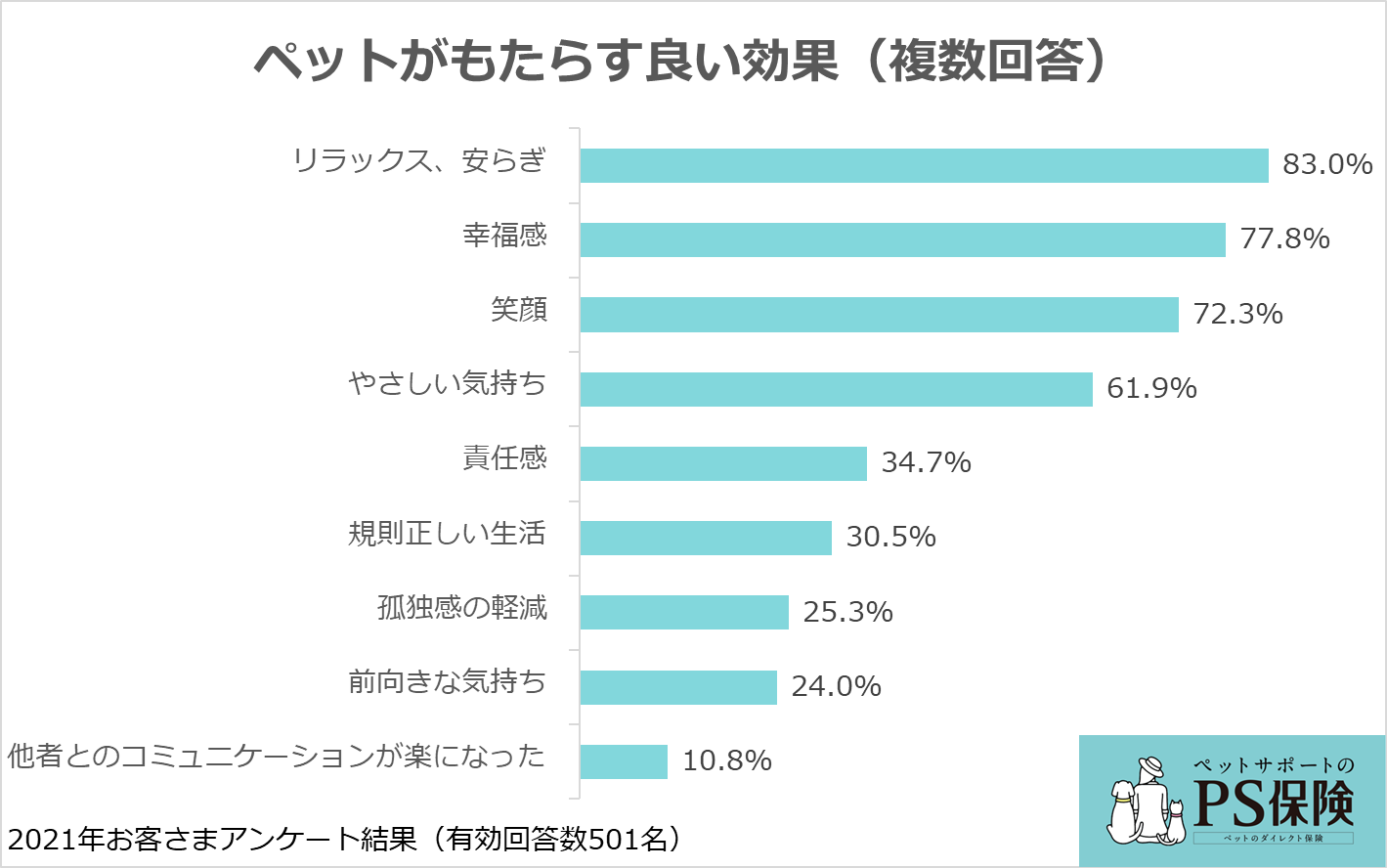 1位は「リラックス、安らぎ」(83.0%)で、2位「幸福感」(77.8%)、3位「笑顔」(72.3%)、4位「やさしい気持ち」(61.9%)が続きます。このことから回答者の多くが、ペットから「癒し」の効果を得ており、ペットへの感謝の気持ちが増していると考えられます。