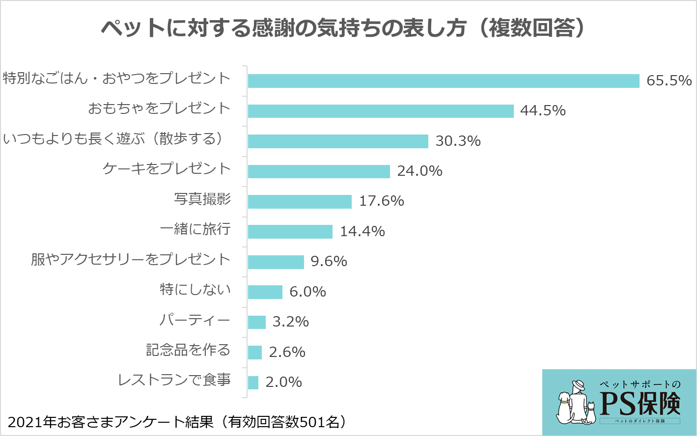 ペットへの感謝の気持ちの表し方として、最も回答率が高かったのは、「特別なごはん・おやつをプレゼント」(65.5%)でした。続く2位は、「おもちゃをプレゼント」(44.5%)、3位は、「いつもより長く遊ぶ(散歩する)」(30.3%)という結果になりました。これら上位3つは、ペットを喜ばせようという、回答者の思いが感じられます。