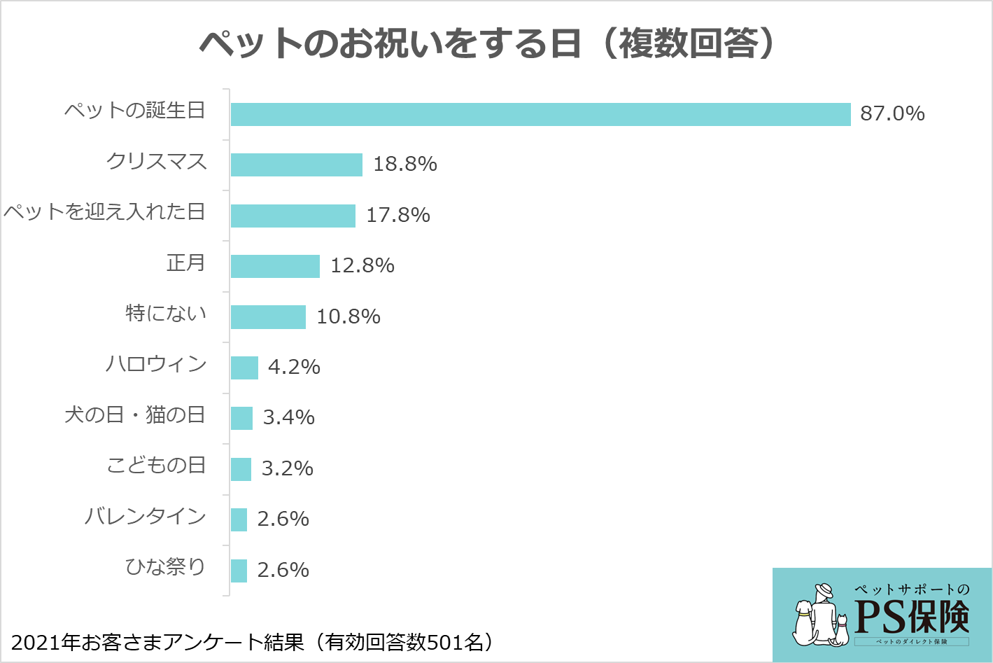 ペットのお祝いをする日1位は、「ペットの誕生日」(87.0%)でした。2位は「クリスマス」(18.8%)、3位「ペットを迎え入れた日」(17.8%)、4位「正月」(12.8%)と続きますが、「ペットの誕生日」が圧倒しました。