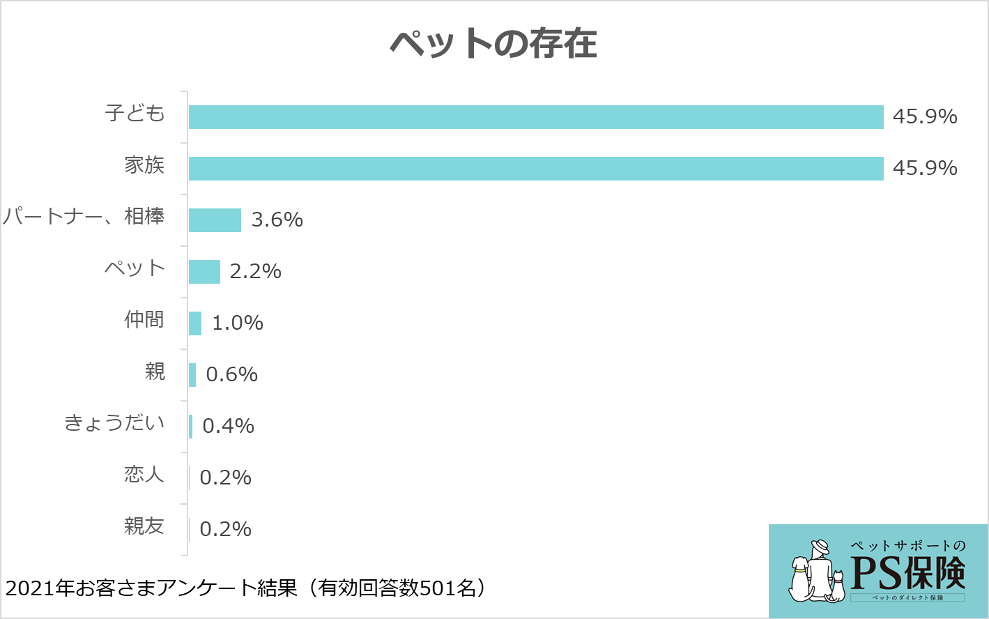 ペットの存在について伺ったところ、1位は同率で「子ども」「家族」(45.9%)で、このふたつで全体の9割を超えました。これにより、回答者にとってペットは単なる愛玩動物ではなく、子どもや家族の一員であることが伺えます。
