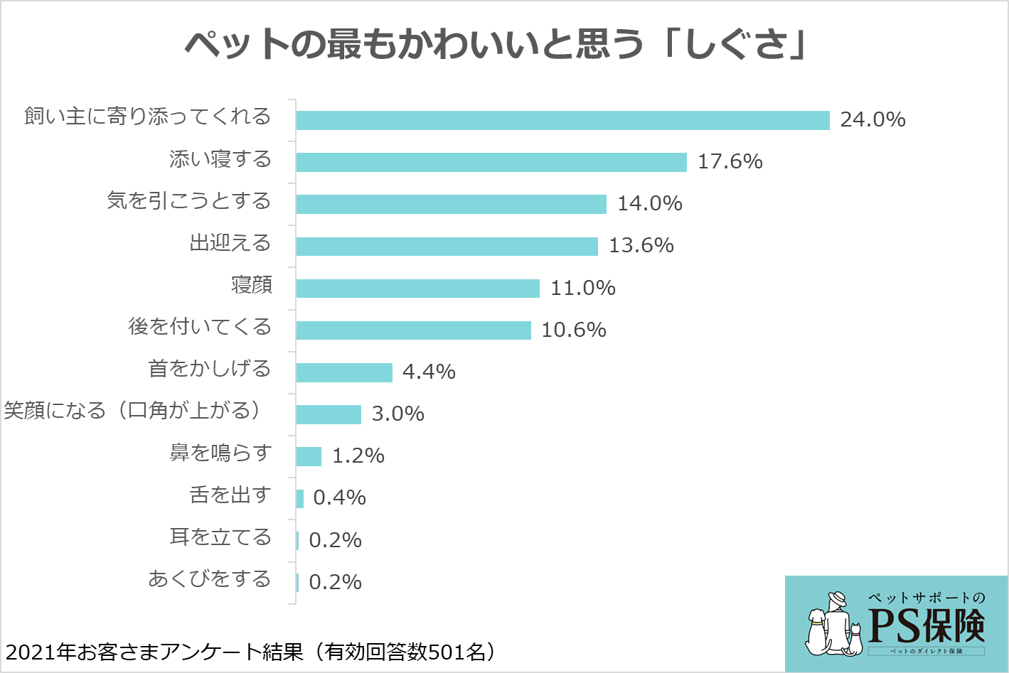 ペット保険の「PS保険」を提供する少額短期保険会社のペットメディカルサポート株式会社(本社:東京都港区赤坂、代表取締役社長:米満 明仁、以下『ペットメディカルサポート』)は、当社ペット保険「PS保険」のご契約者さま3,750名(有効回答数501名)を対象に、11月22日の『ペットたちに「感謝」する日』にちなみ、ペット(犬猫)への感謝に関するアンケート調査を行いました。