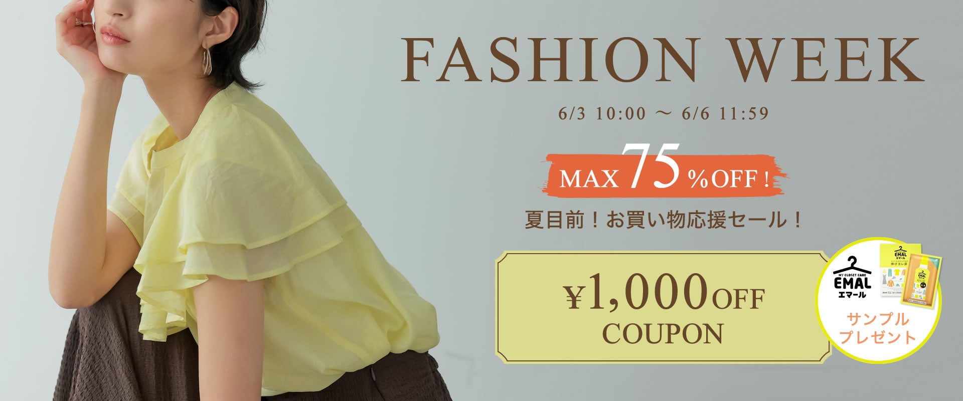 サステナブルアイテムにも使えるMAX1,000円OFFクーポンをプレゼント!その他、今から着られる夏アイテムがMAX75%OFFキャンペーンや、日替わりのTIMEセールが開催。