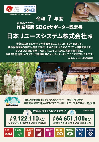 日本リユースシステム株式会社(本社:東京都港区、代表取締役:山田 正人)は2025年10月企業の不要になった作業服を世界で活かす仕組み「古着deワクチン作業服版 まごころプロジェクト」のサービスを開始しました。