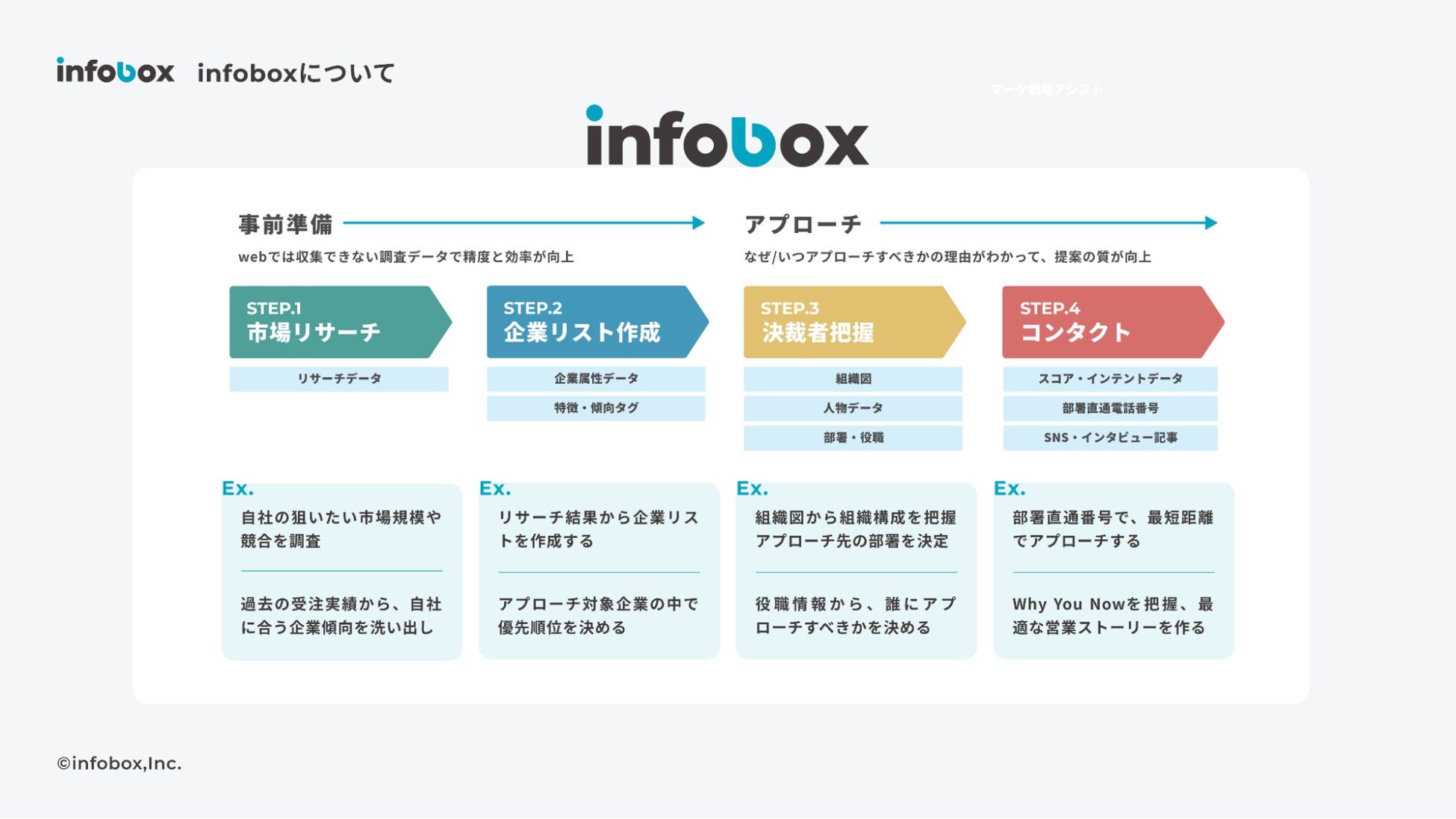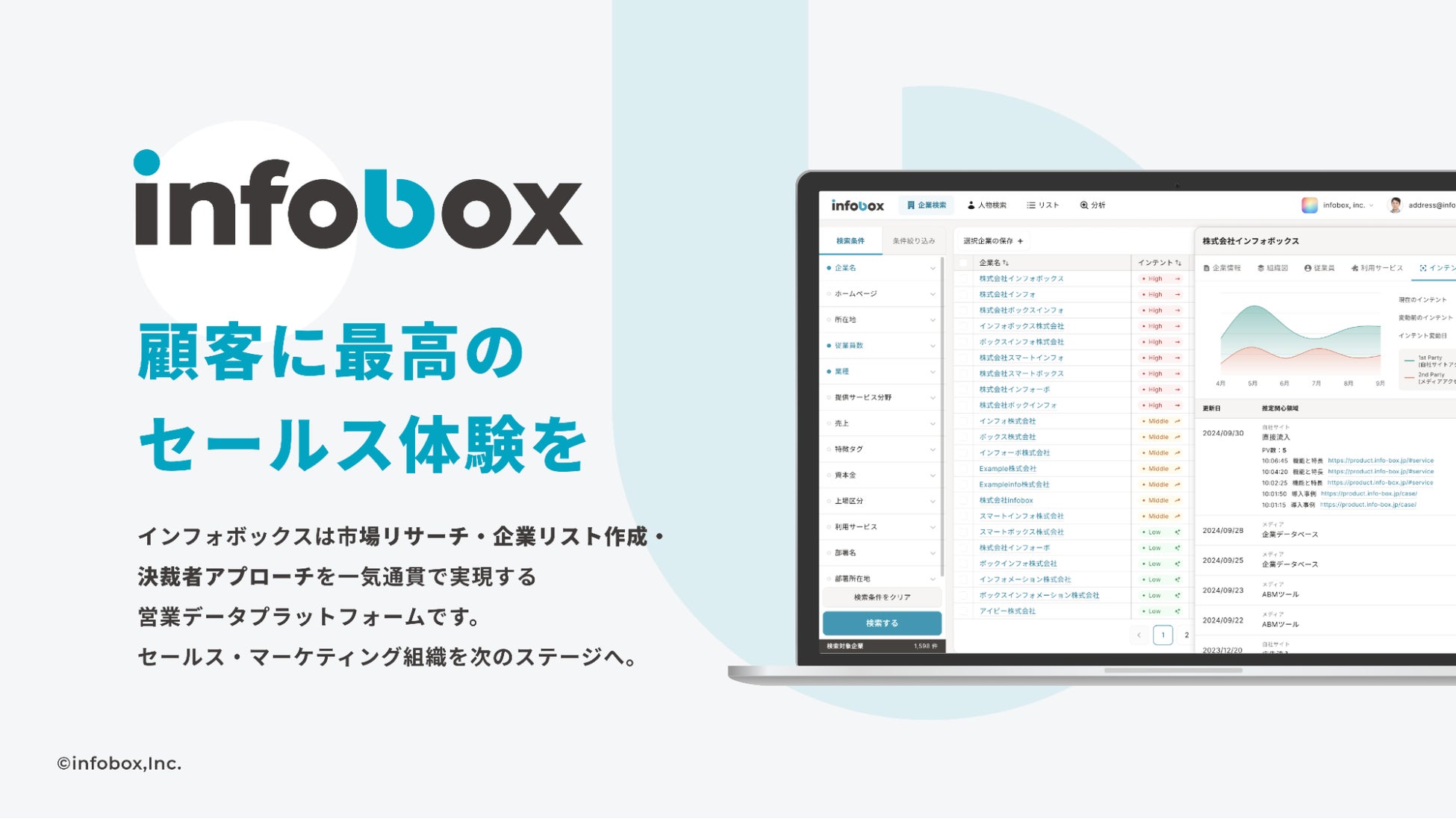 infoboxは、市場リサーチ・企業リスト作成・決裁者アプローチを一気通貫で実現する営業データプラットフォームです。ニーズとタイミングが一致している企業を可視化し、最適な営業活動を実現します。