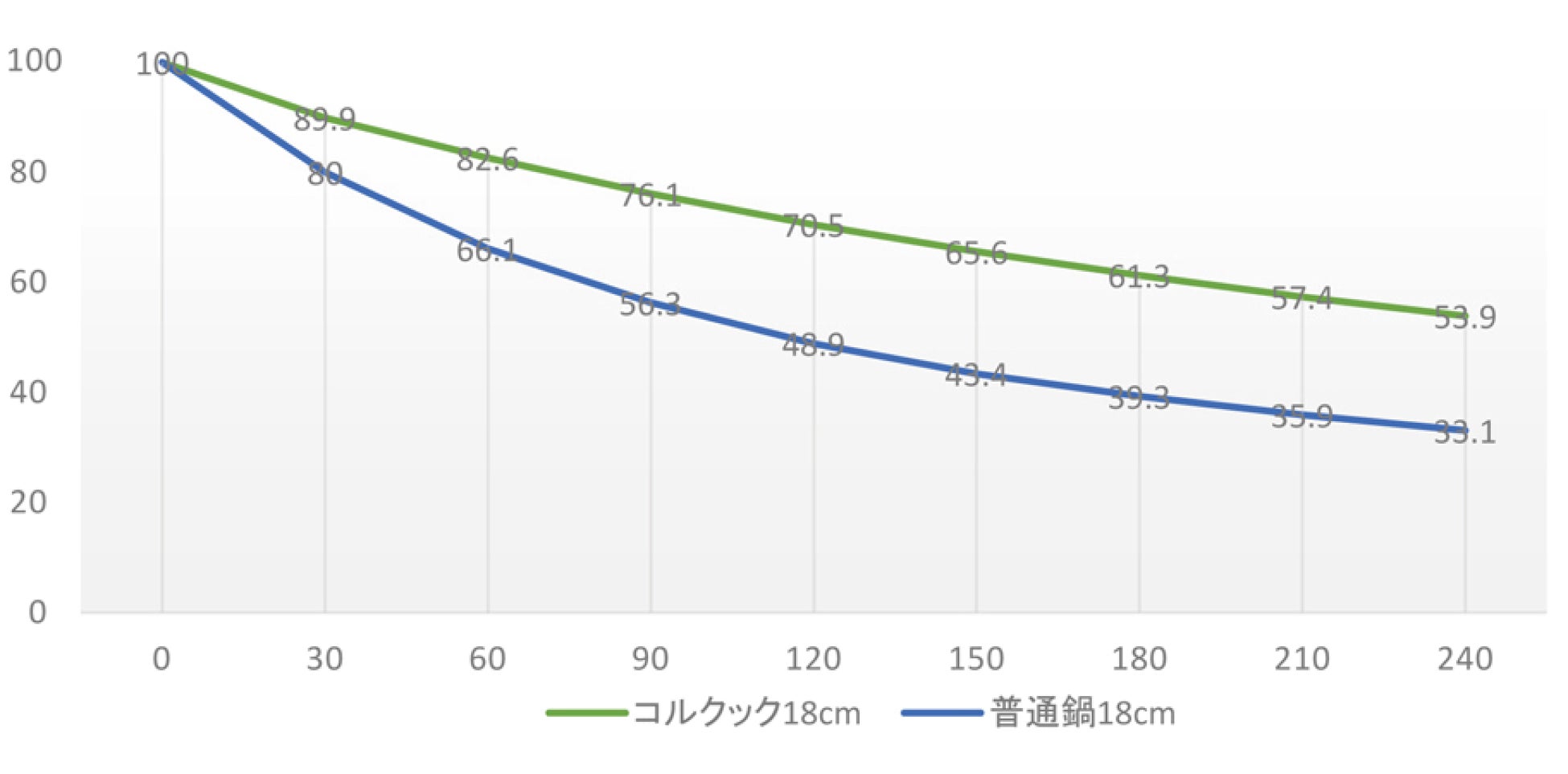 専用のコルク容器は、コルク素材の断熱性を活かした設計。加熱後に鍋をセットすると、内部の熱を外に逃がしにくく、約70℃の温度を約2 時間キープします。一般的な鍋と比較すると温度の下がり方が緩やかで、調理後の余熱を効率よく活かせます。ゆっくりと温度が下がることで、食材にしっかりと味が染み込みます。