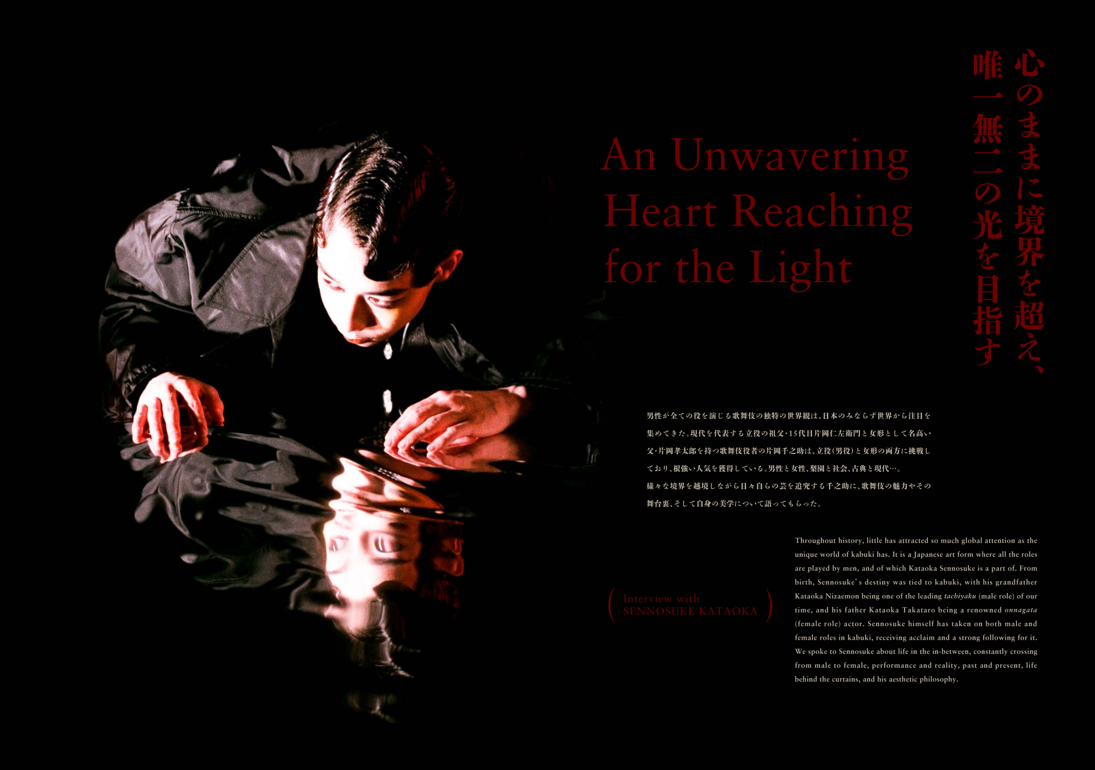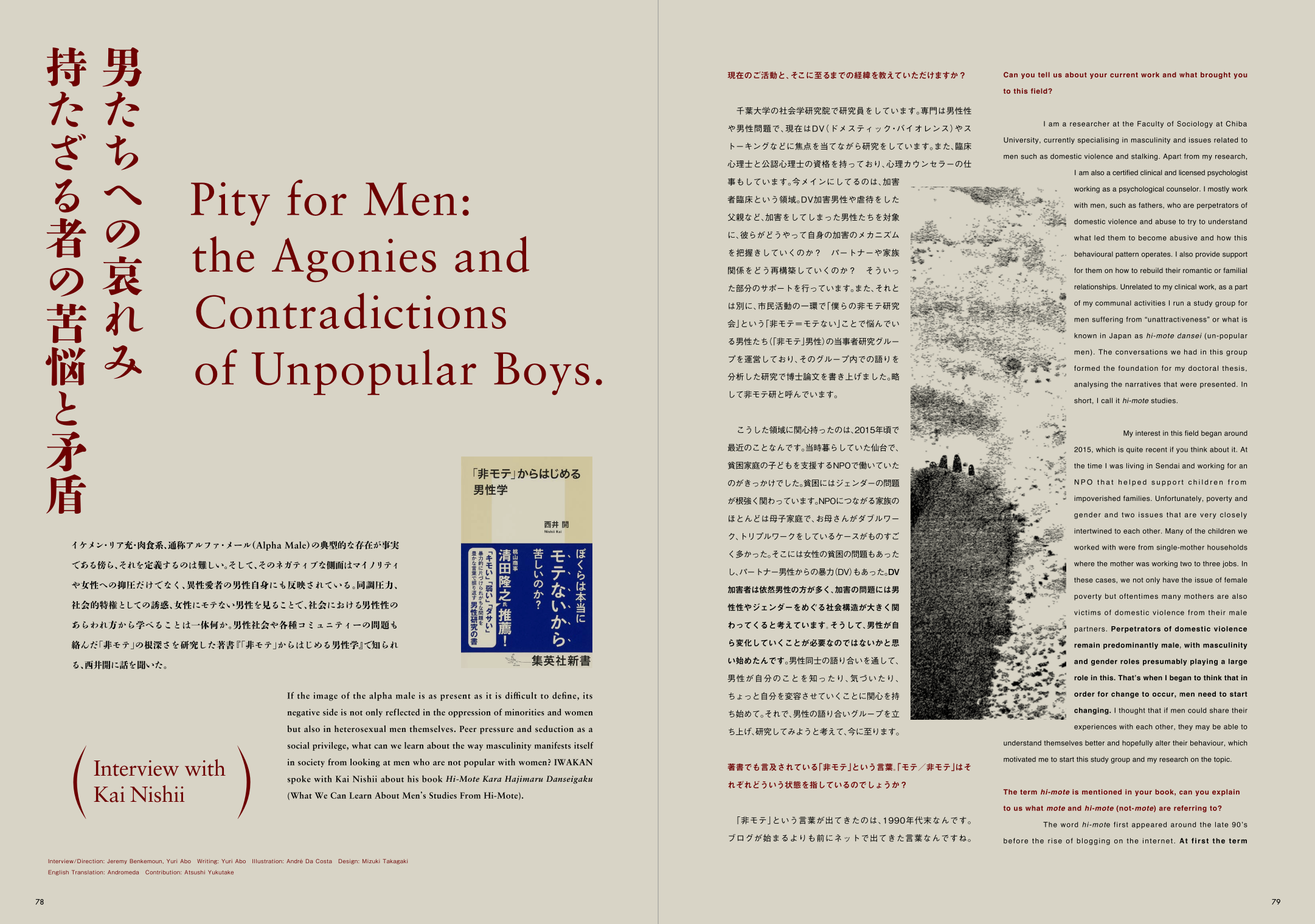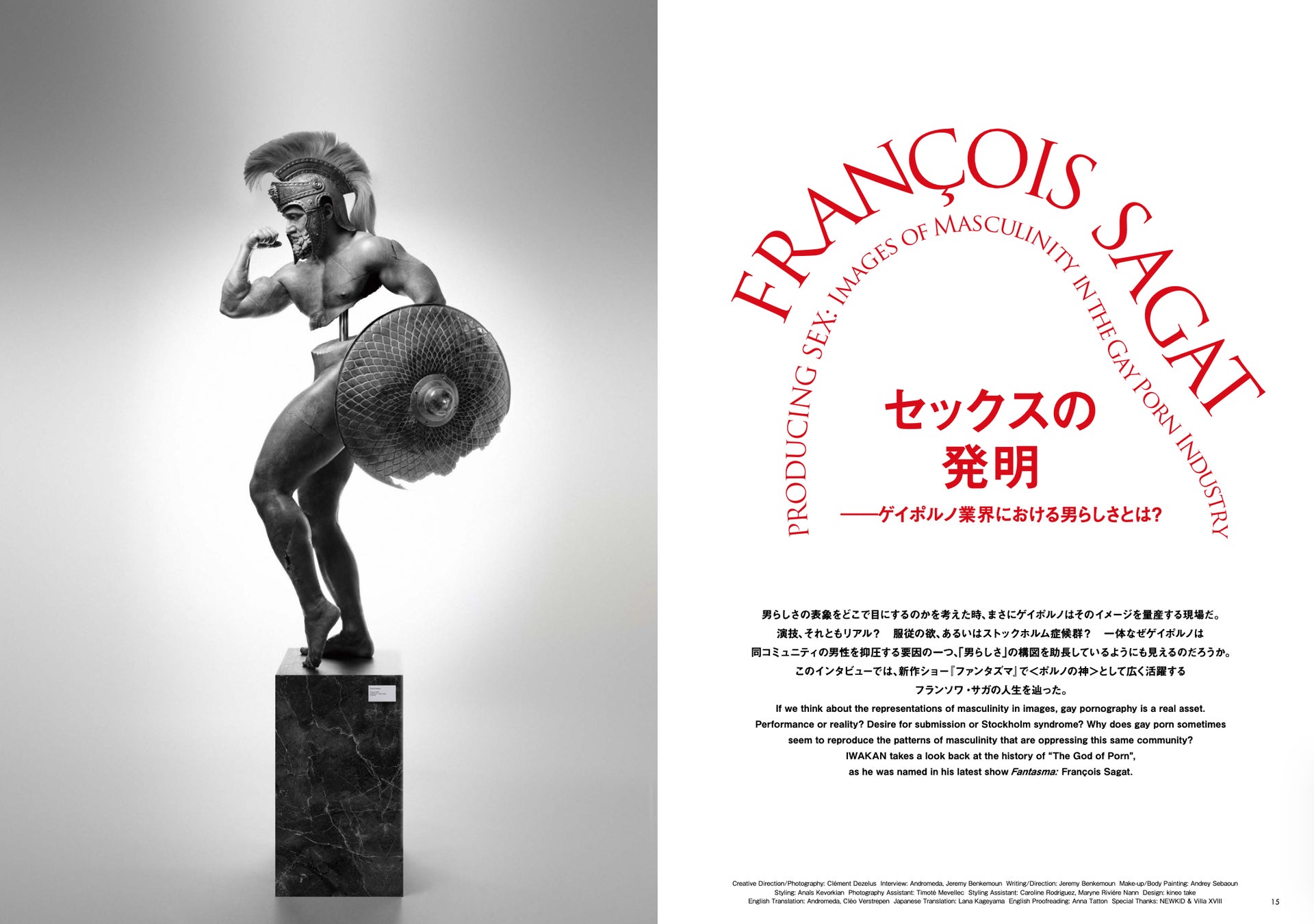 特集には、『「非モテ」からはじめる男性学』で知られる西井開氏や、立役と女形の両方に挑戦する歌舞伎役者・片岡千之助氏、ゲイポルノ俳優のフランソワ・サガ(Francois Sagat)氏、パリを拠点に活動するビジュアルアーティストのジャック・メルル(Jacques Merle)氏など、国内外で活躍する面々が登場し、インタビュー取材やアートワークなど、多様なコンテンツが盛り込まれています。IWAKAN Magazine初となる、日英バイリンガルでお届けします。