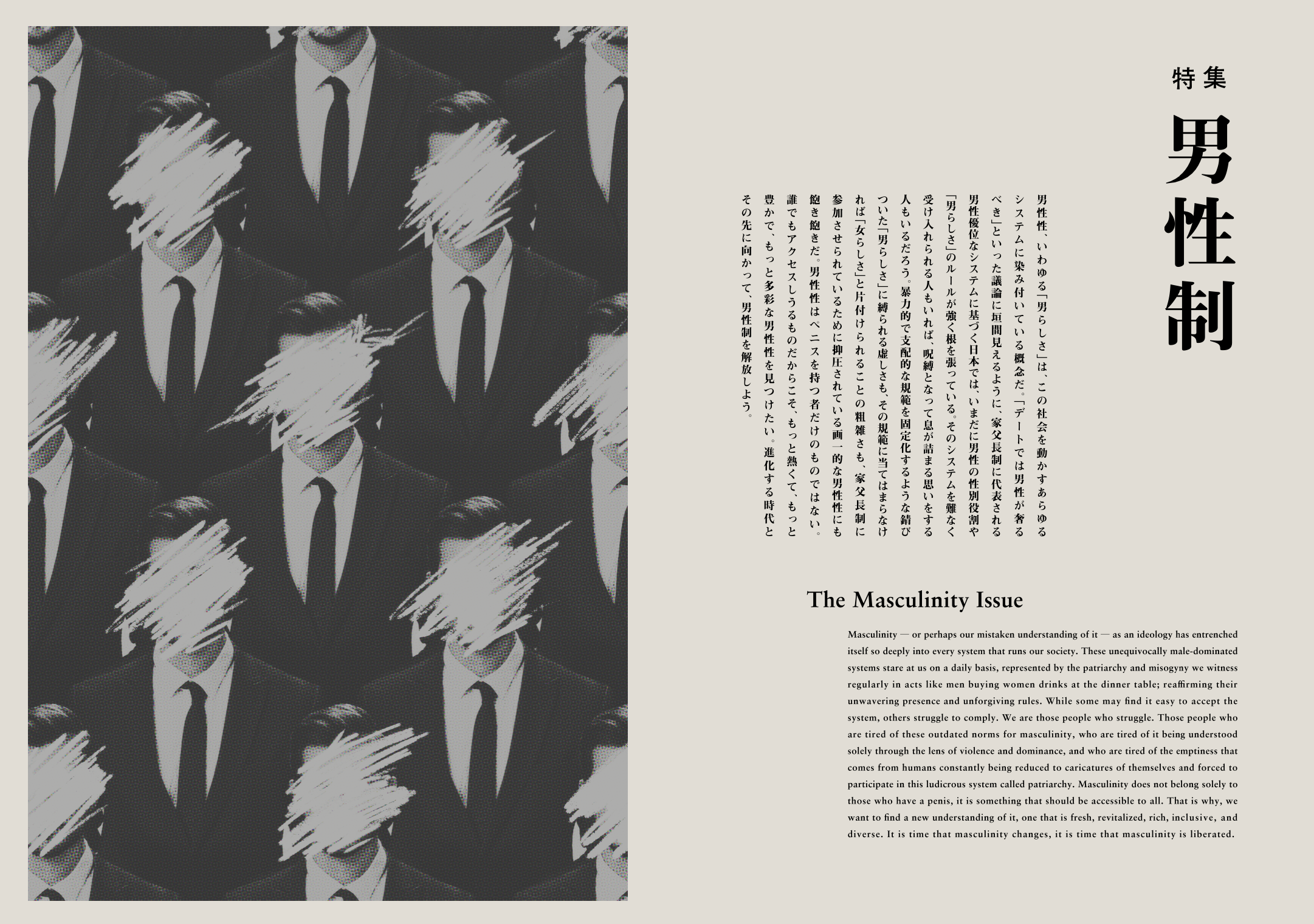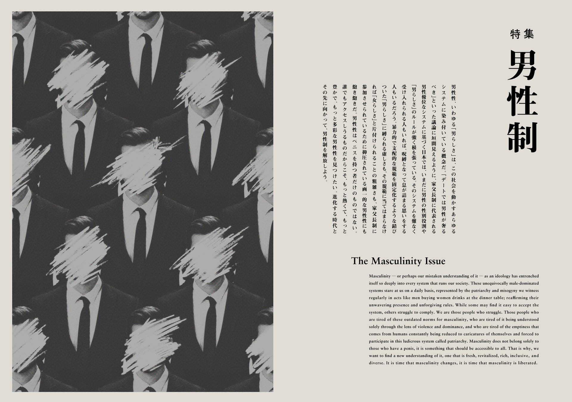 特集号「男性制」では、「男性性(=男らしさ、マスキュリニティ)」に焦点を当て、社会のあらゆる側面に潜む男性性について、ゲイポルノ、職業選択、メンタルヘルス、DV・暴力、セックス、アート・身体表現などの観点から問題意識を深め、議論することを目指しています。男性性はペニスを持つ者だけのものではありません。家父長制に参加させられているために抑圧されている個人を解放するために、この錆びつき、固定化された「男らしさ」に“違和感”を問いかけ、進化する時代と社会の中で新たな男性性を探求します。