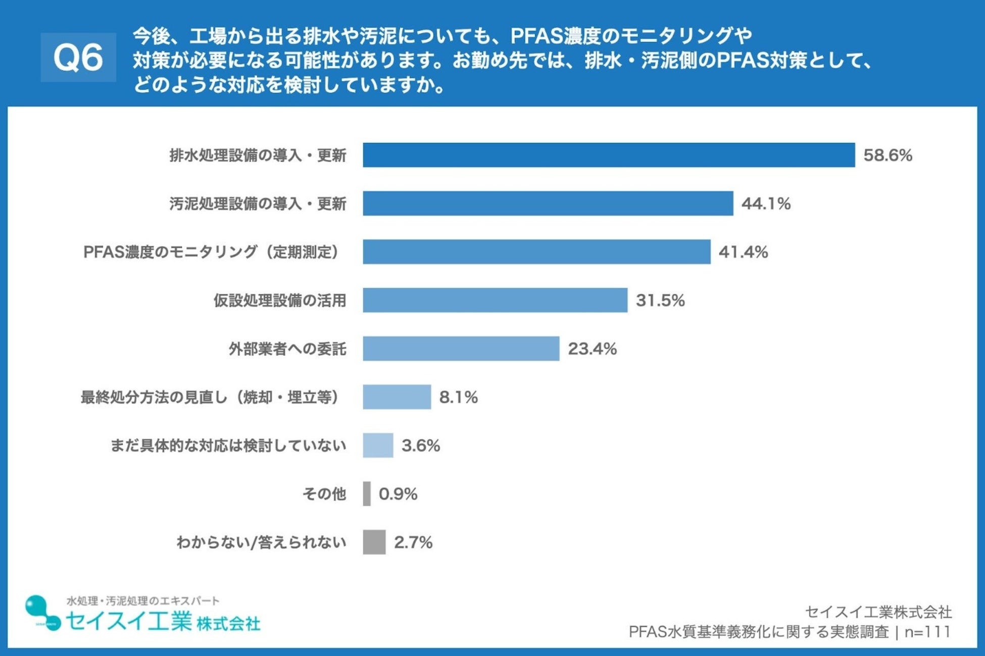 「Q6. 今後、工場から出る排水や汚泥についても、PFAS濃度のモニタリングや対策が必要になる可能性があります。お勤め先では、排水・汚泥側のPFAS対策として、どのような対応を検討していますか。(複数回答)」(n=111)と質問したところ、「排水処理設備の導入・更新」が58.6%、「汚泥処理設備の導入・更新」が44.1%、「PFAS濃度のモニタリング(定期測定)」が41.4%という回答となりました。