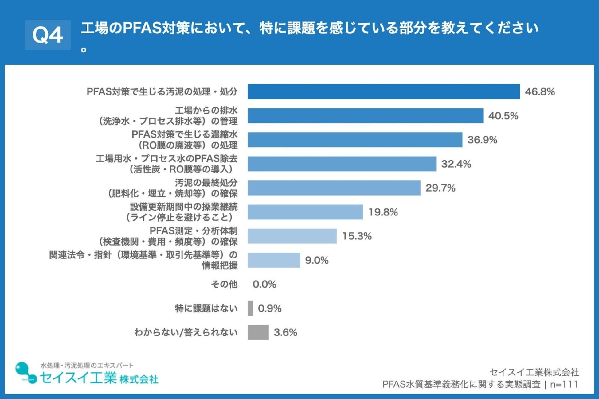 「Q4. 工場のPFAS対策において、特に課題を感じている部分を教えてください。(複数回答)」(n=111)と質問したところ、「PFAS対策で生じる汚泥の処理・処分」が46.8%、「工場からの排水(洗浄水・プロセス排水等)の管理」が40.5%、「PFAS対策で生じる濃縮水(RO膜の廃液等)の処理」が36.9%という回答となりました。