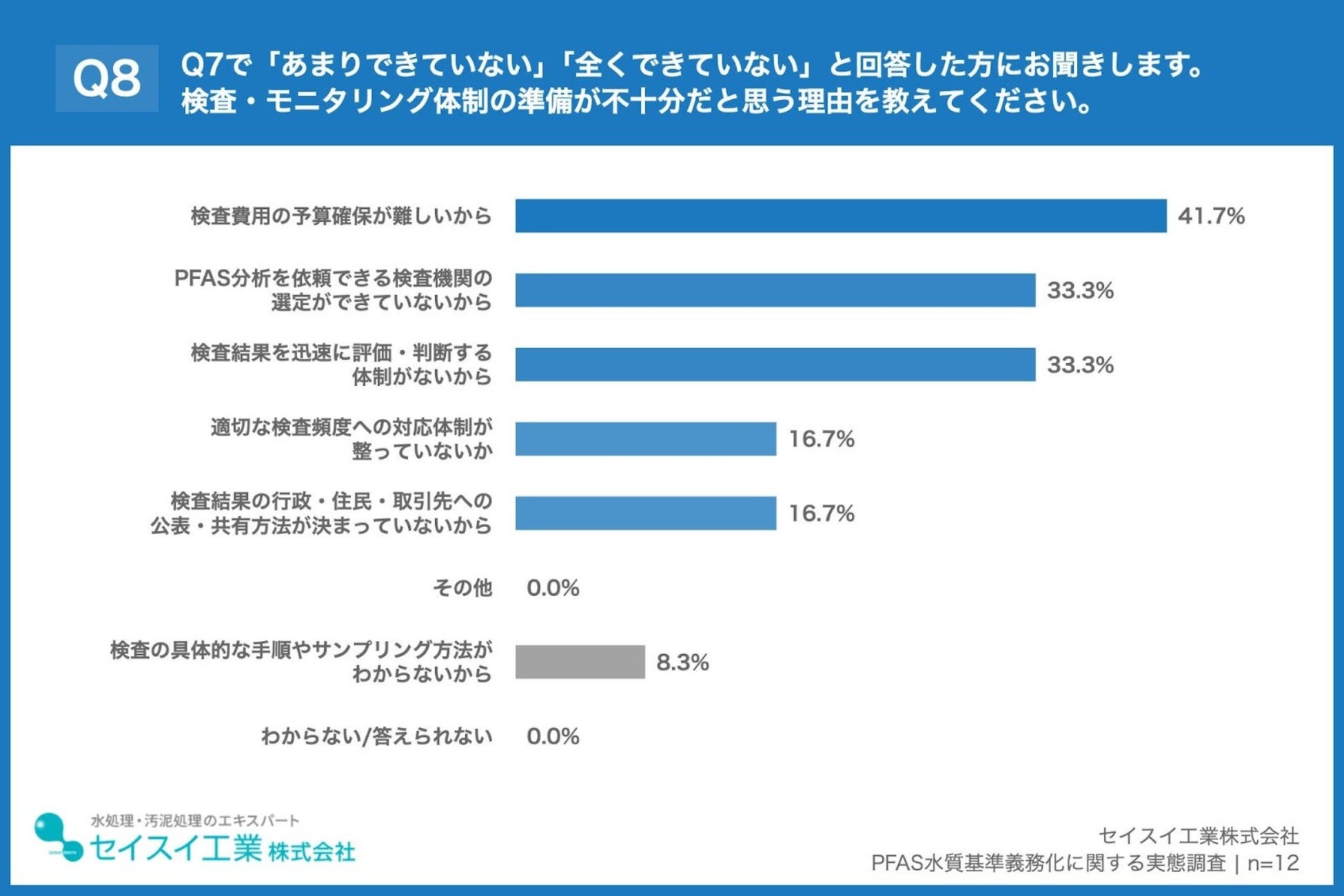 「Q8. Q7で「あまりできていない」「全くできていない」と回答した方にお聞きします。検査・モニタリング体制の準備が不十分だと思う理由を教えてください。(複数回答)」(n=12)と質問したところ、「検査費用の予算確保が難しいから」が41.7%、「PFAS分析を依頼できる検査機関の選定ができていないから」が33.3%、「検査結果を迅速に評価・判断する体制がないから」が33.3%という回答となりました。