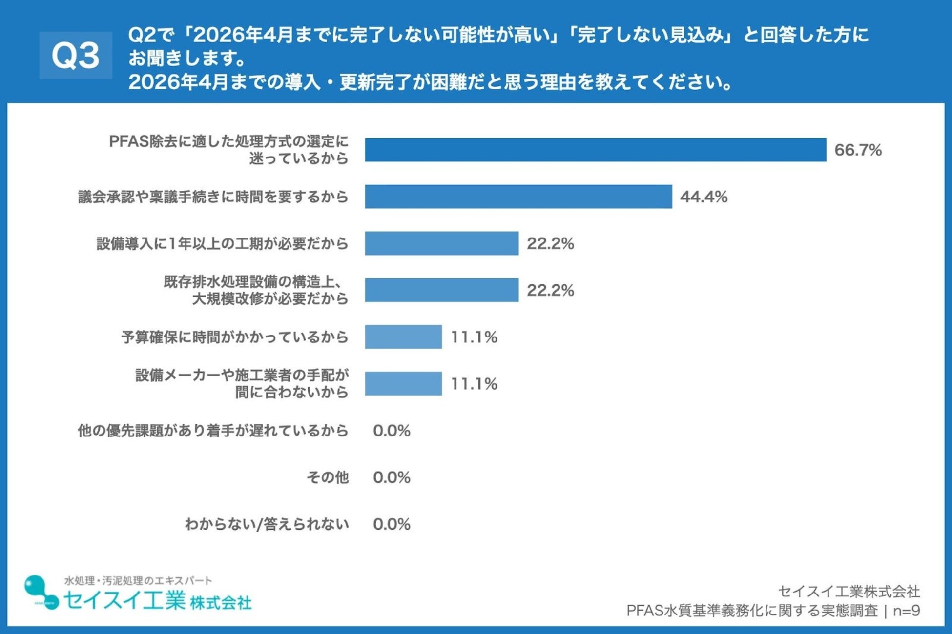 「Q3. Q2で「2026年4月までに完了しない可能性が高い」「完了しない見込み」と回答した方にお聞きします。2026年4月までの導入・更新完了が困難だと思う理由を教えてください。(複数回答)」(n=9)と質問したところ、「PFAS除去に適した処理方式の選定に迷っているから」が66.7%、「議会承認や稟議手続きに時間を要するから」が44.4%、「設備導入に1年以上の工期が必要だから」が22.2%という回答となりました。