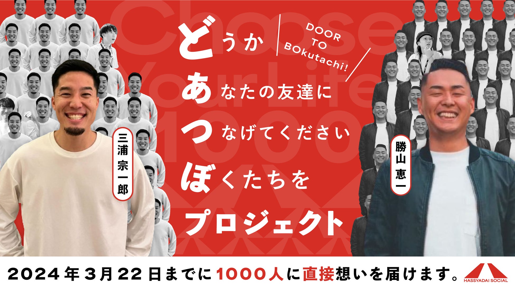 「CHOOSE YOUR LIFE!それでもなお、人生は選べる。」をビジョンに掲げる一般社団法人HASSYADAI social(代表:勝山 恵一・三浦 宗一郎、以下ハッシャダイソーシャル)は、メンバーが1000人のもとへ足をはこぶプロジェクト「どうか、あなたの友達に、つなげてください、ぼくたちを。プロジェクト」、通称「どあつぼプロジェクト」を開始いたします。ハッシャダイソーシャルの想いをひとりでも多くの方に届けるための試行錯誤の結果、「やっぱりおれたちは、直接会ったり、直接話をさせてもらいたいんだ」という結論に至りました。ちょっと変わった名前のプロジェクトですが、ぜひご一読ください。