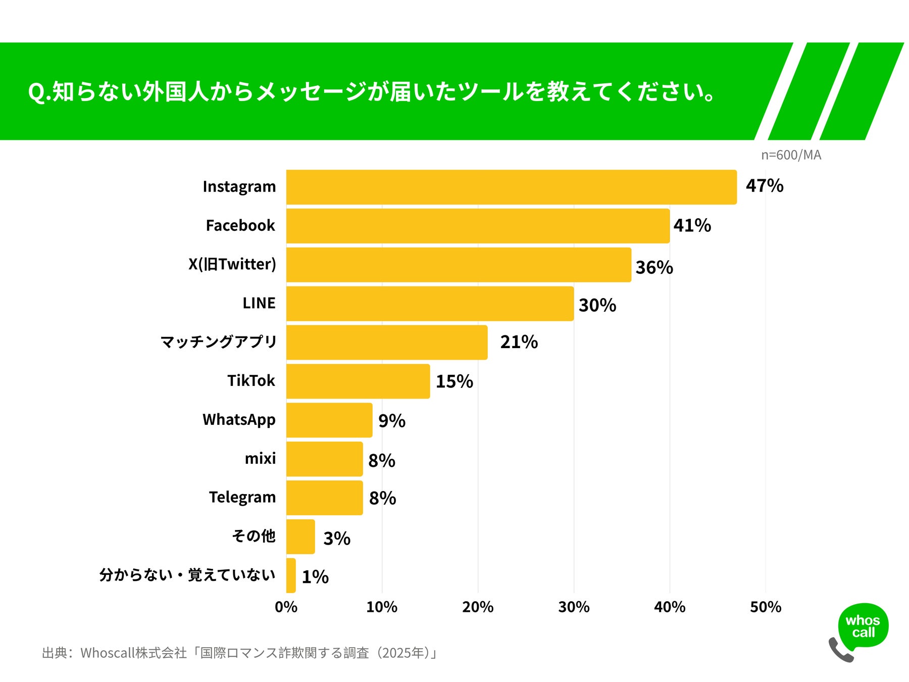 メッセージが届いたツールについて調査したところ、最多が「Instagram(47%)」、次いで「Facebook(41%)」「X(旧Twitter)(36%)」「LINE(30%)」「マッチングアプリ(21%)」となりました。