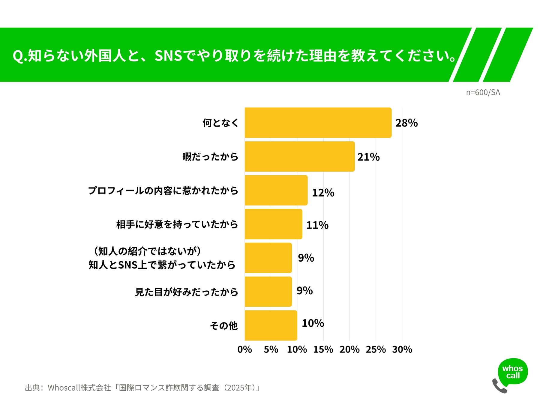 知らない外国人とSNSでやり取りを続けた理由について質問したところ、最多が「なんとなく(28%)」次いで「暇だったから(21%)」「プロフィールの内容に惹かれたから(12%)」「相手が自分に好意を持っていたから(11%)」となりました。