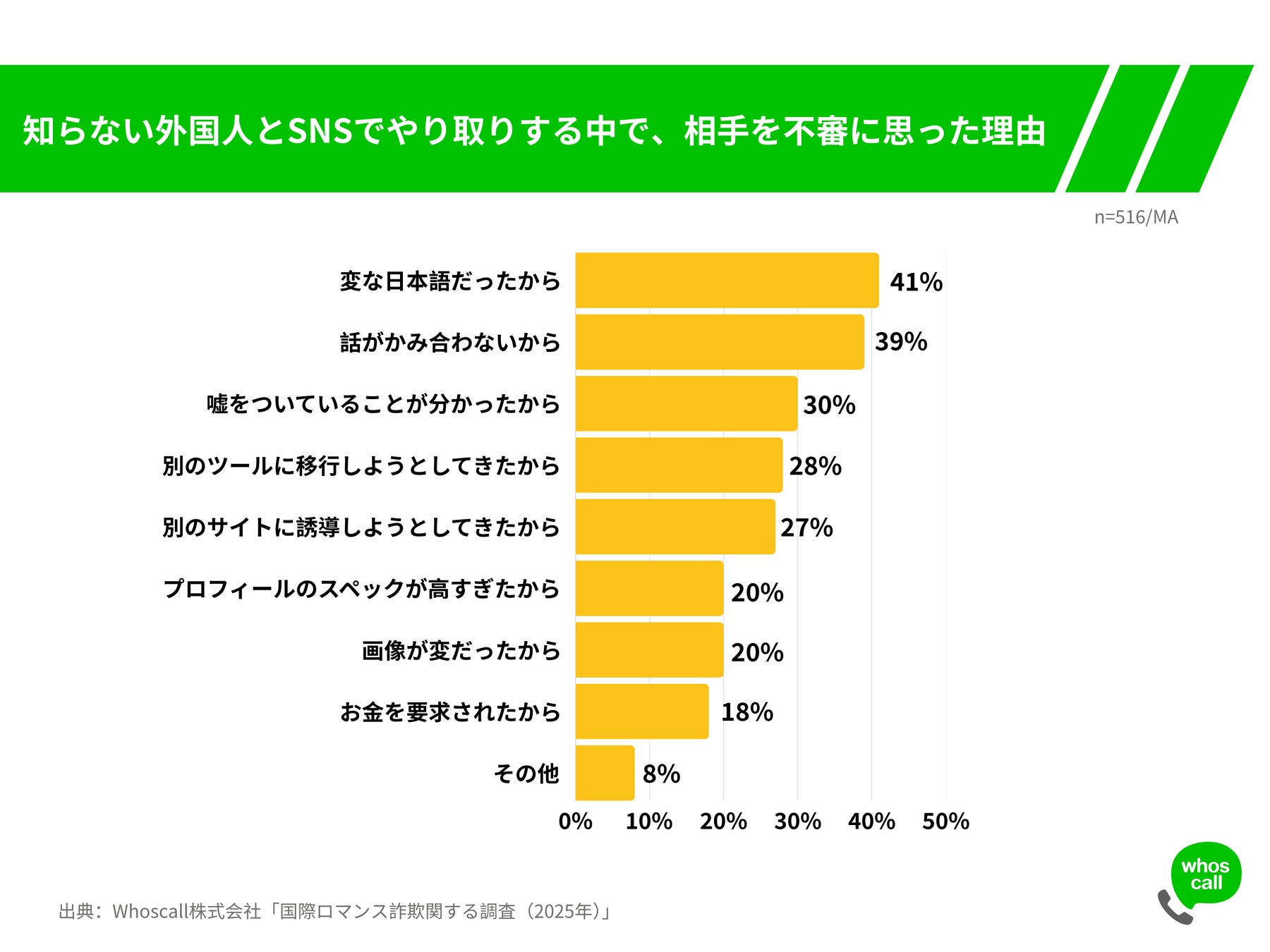 その理由について質問したところ、最多が「変な日本だったから(41%)」次いで、「話がかみ合わないから(39%)」「嘘をついていることが分かったから(30%)」となりました。