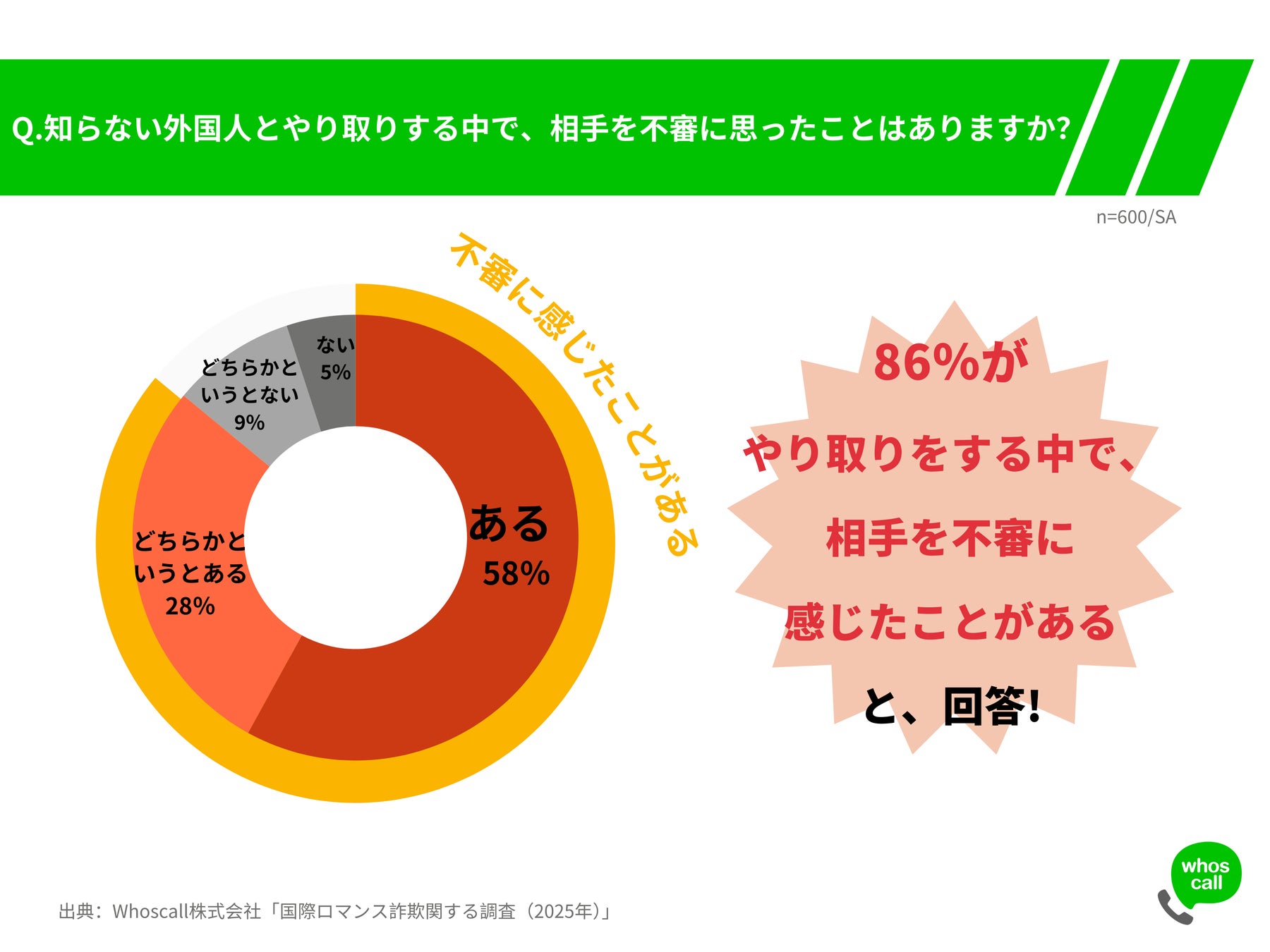 知らない外国人とSNSでやり取りをする中で、相手を不審に思ったことがあるか質問したところ、86%が「相手を不審に感じたことがある」と回答しました。