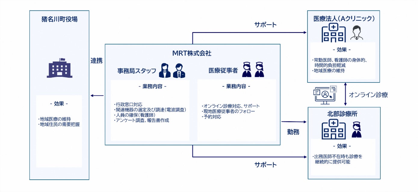 このような状況をふまえ、医療DXの活用により、北部診療所でのオンライン診療を試みることで地域での医療機関受診体制の構築に向けた実証実験を行います。MRTは、町の地域医療を支えてきた医師や自治体の方々と共に、住民のみなさまの健康をお守りする一助となれるよう、これまで培ってきた知見と経験を活かして医療体制構築を推進してまいります。