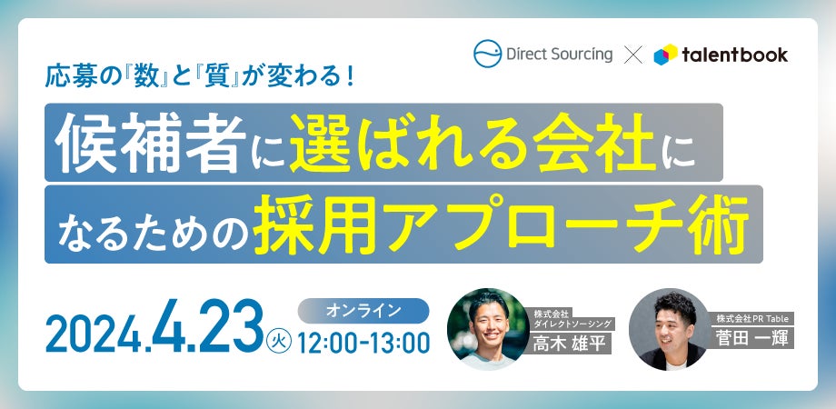 「働く人」から企業の魅力を伝える採用ブランディングサービス「talentbook」を運営する株式会社PR Table(住所:東京都千代田区、共同代表取締役:大堀航・大堀海 以下、当社)は、2024年4月23日(火)に株式会社ダイレクトソーシング 高木 雄平氏をお招きし「採用アプローチ」をテーマとしたオンラインイベントを開催いたします。
