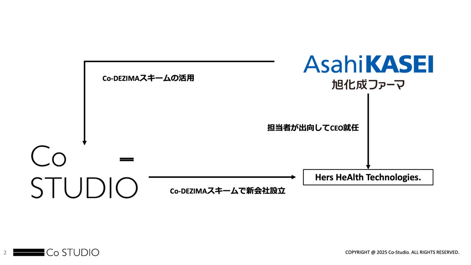 Co-Studio株式会社(本社:東京都中央区、代表取締役:澤田 真賢、以下「当社」)は、旭化成ファーマ株式会社(本社:東京都千代田区、社長:青木 喜和、以下「旭化成ファーマ」)と連携し、当社が展開する出島型新規事業創出スキーム「Co-DEZIMA」を活用して、新会社「Hers HeAlth Technologies Inc.(ハーズ ヘルス テクノロジーズ株式会社)」の設立を支援しました。