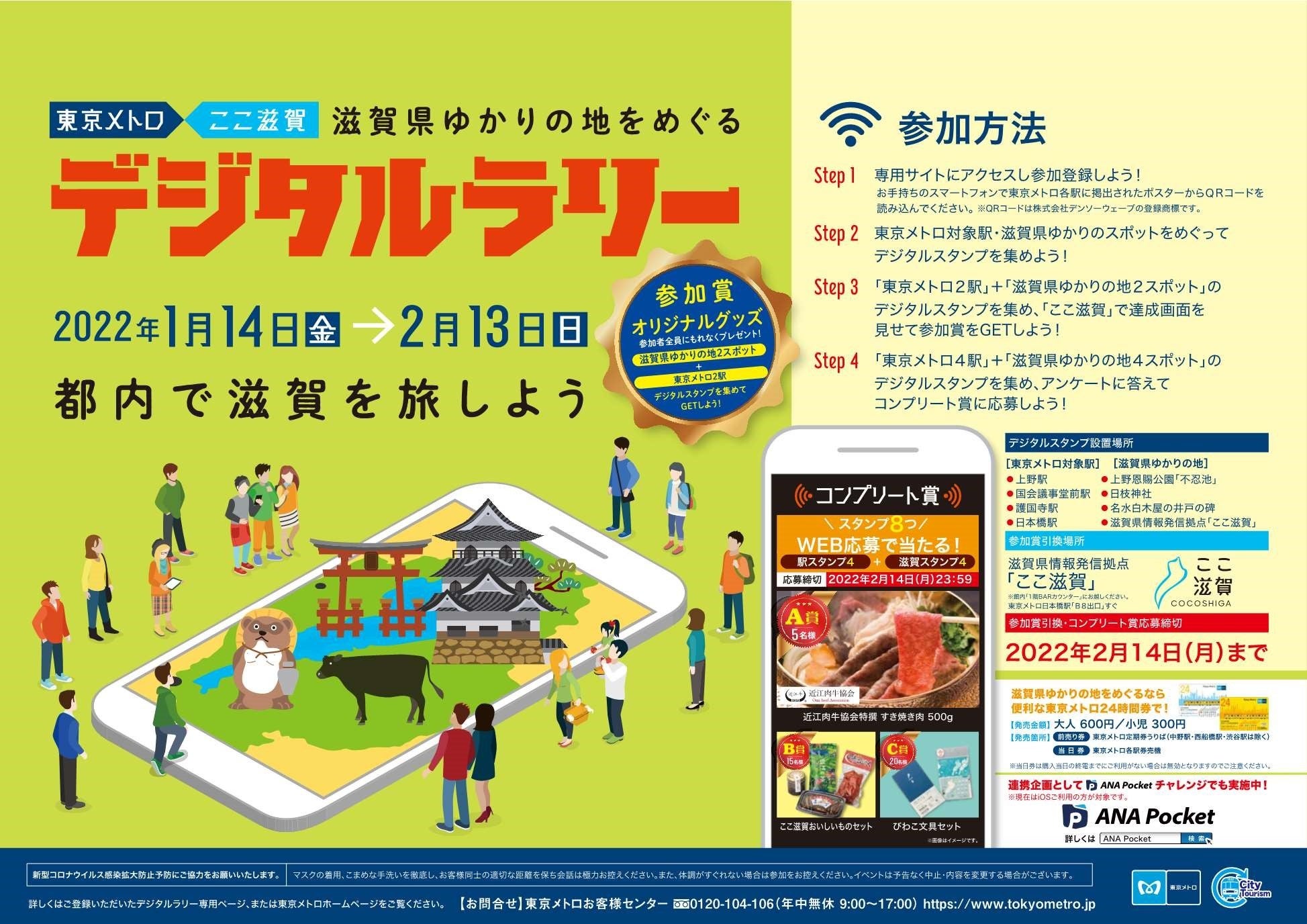 滋賀県は、東京地下鉄株式会社(以下「東京メトロ」)と連携し、“東京都内にいながら滋賀県を旅しよう”をテーマに、東京メトロ沿線にある滋賀県ゆかりの地をめぐるスマートフォン活用の非接触型デジタルスタンプラリーイベントを2022年1月14日(金)から2月13日(日)まで実施します。