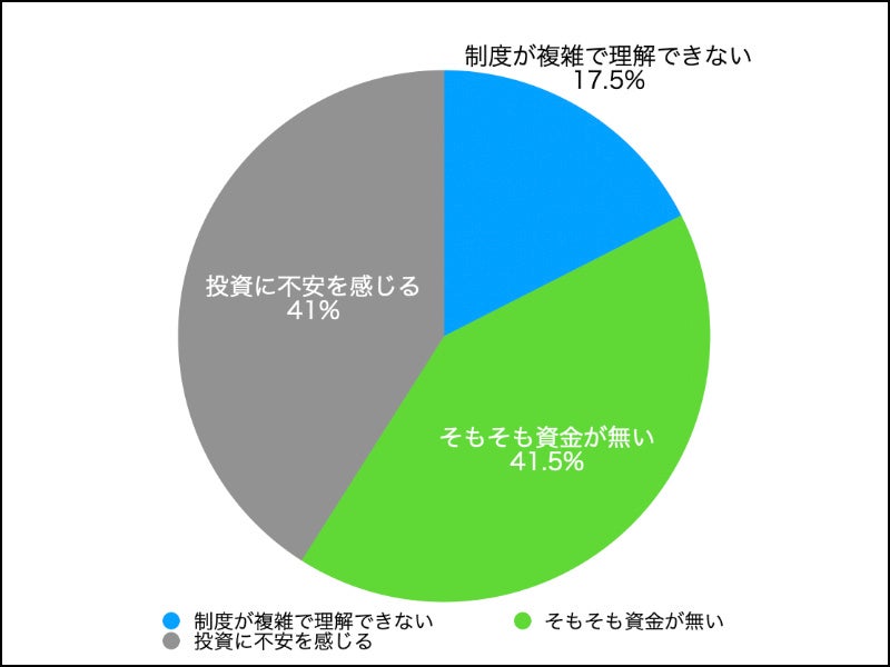 この質問には「そもそも資金が無い」と回答した人が41%となっていて「投資に不安を感じる」も41%とほぼ同数でした。