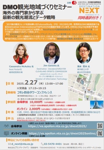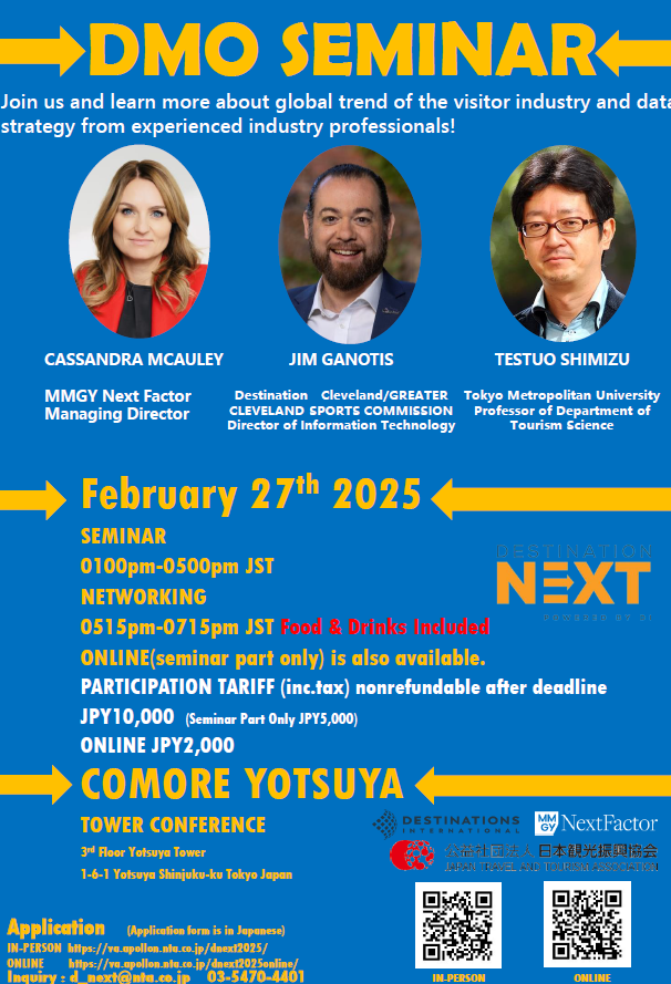 公益社団法人日本観光振興協会(本部:東京都港区 会長 菰田 正信(三井不動産株式会社代表取締役会長))では、昨年に続き海外DMOの実務家を招聘し「DMO観光地域づくりセミナー」を開催します。